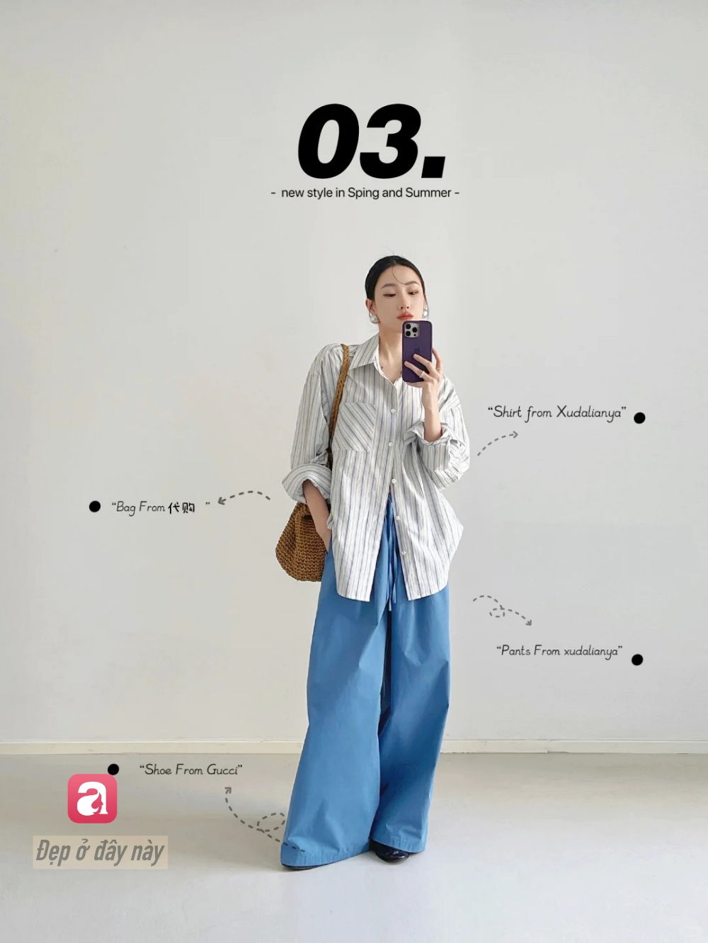 Sơ mi sọc giúp outfit có chiều sâu thị giác, tránh sự đơn điệu. Kết hợp với quần xanh dáng rộng tạo nên một tổng thể phóng khoáng, mang hơi hướng unisex.