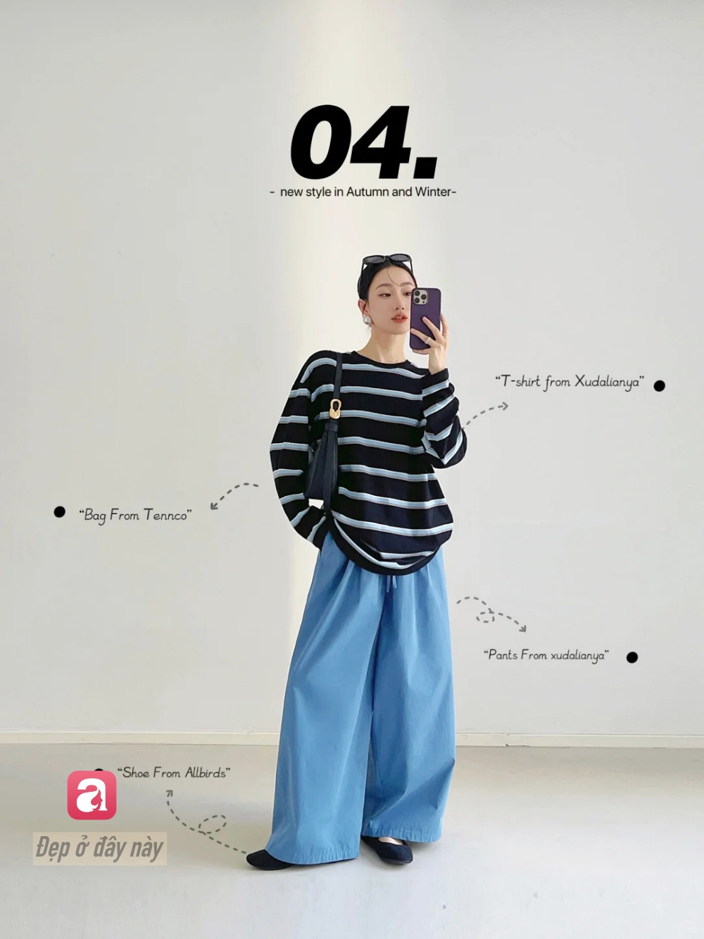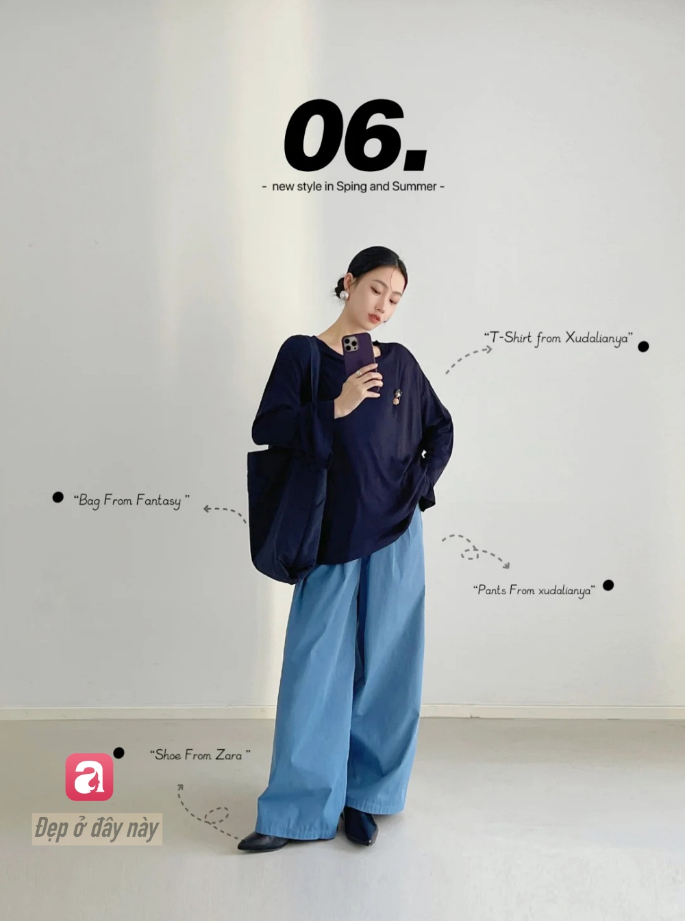 Áo navy giúp tổng thể trông gọn và “đằm” hơn, trong khi quần xanh sáng giữ lại sự trẻ trung. Sự tương phản nhẹ giữa 2 sắc độ xanh chính là điểm đắt giá.