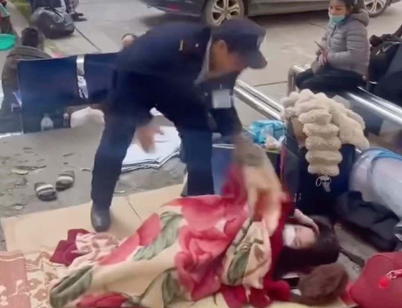 Ngày 8/1, mạng xã hội lan truyền đoạn clip ghi lại cảnh một nhân viên bảo vệ tại Bệnh viện Bạch Mai giật và ném chăn của người nhà bệnh nhân đang nằm trong khuôn viên bệnh viện.