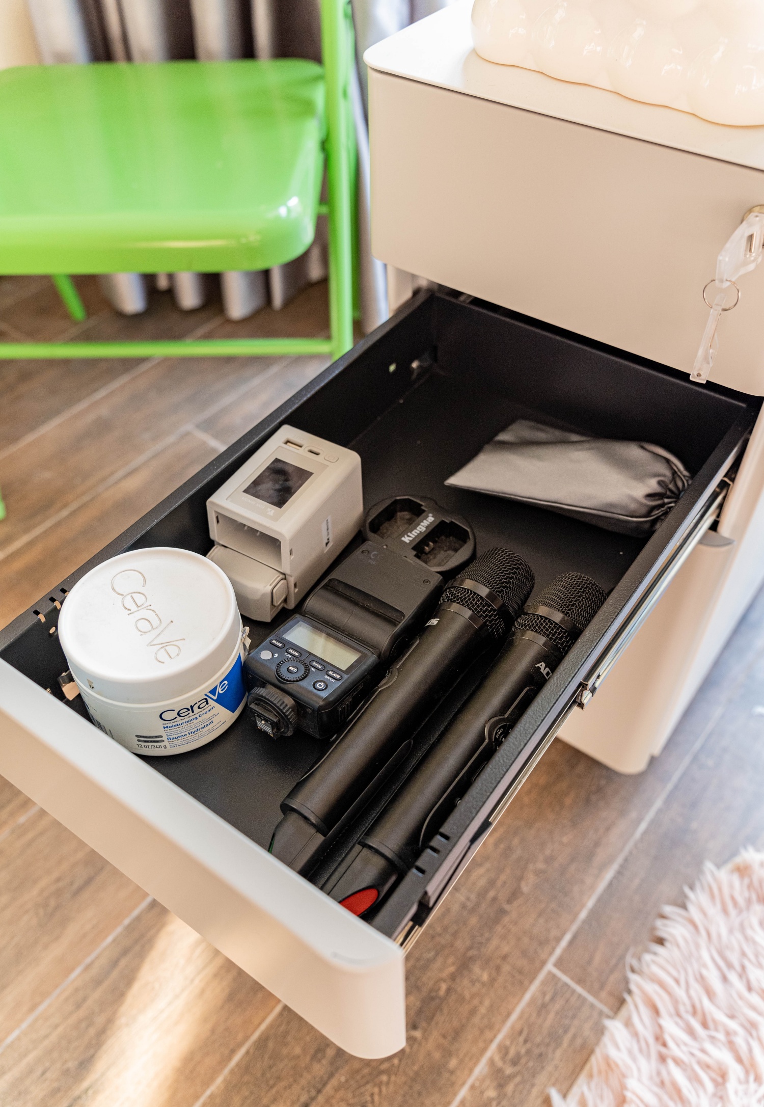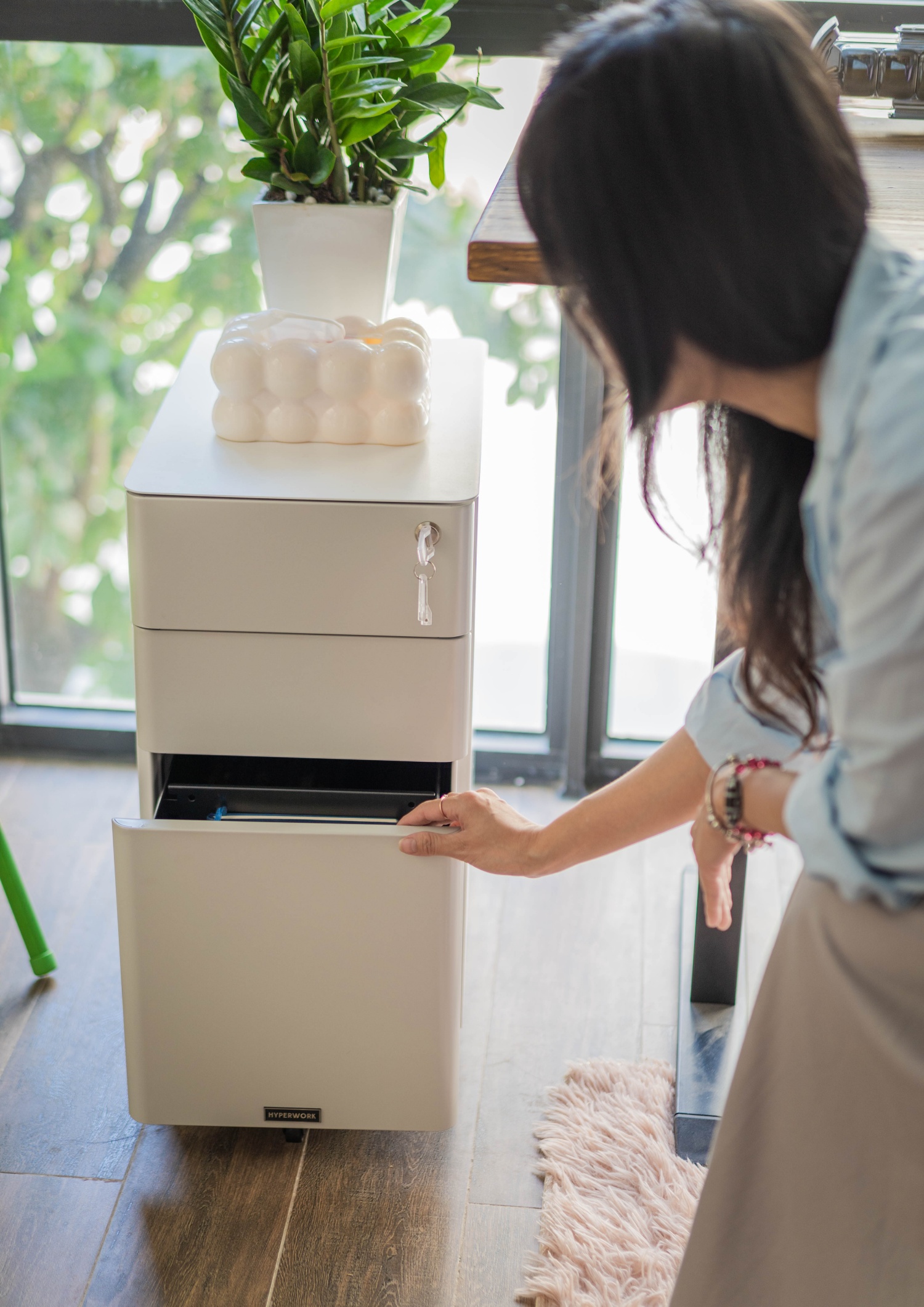 Trong phòng làm việc nên có một chiếc tủ để đựng đồ gần với vị trí của bàn, bởi chiếc tủ là nơi đựng được rất nhiều thứ và mang đến sự gọn gàng, thay vì chúng ta cứ bày đồ ra bàn một cách bừa bộn. Phương chọn chiếc tủ của HyperWork, chiếc tủ này sử dụng thép uốn cong nên vẫn tạo cảm giác mềm mại, đẹp mắt. Ưu điểm của tủ là có bánh xe nên dễ dàng di chuyển đến nhiều vị trí khác nhau. Tủ có 3 ngăn với các ngăn được chia nhỏ có thể điều chỉnh được, từ đó người dùng dễ dàng sắp xếp đồ theo ý muốn. Ví dụ, ngăn trên cùng có thể sử dụng để đựng bút, thước, hay các món đồ nhỏ dễ thất lạc. Ngăn thứ 2 dùng để đựng giấy tờ cơ bản. Ngăn ở dưới cùng to nhất thì thích hợp để đựng hồ sơ, tài liệu. Thay vì chọn các loại tủ gỗ văn phòng trông nhàm chán thì Phương chọn mẫu tủ của HyperWork này vì thiết kế đẹp mà lại tiện dụng.