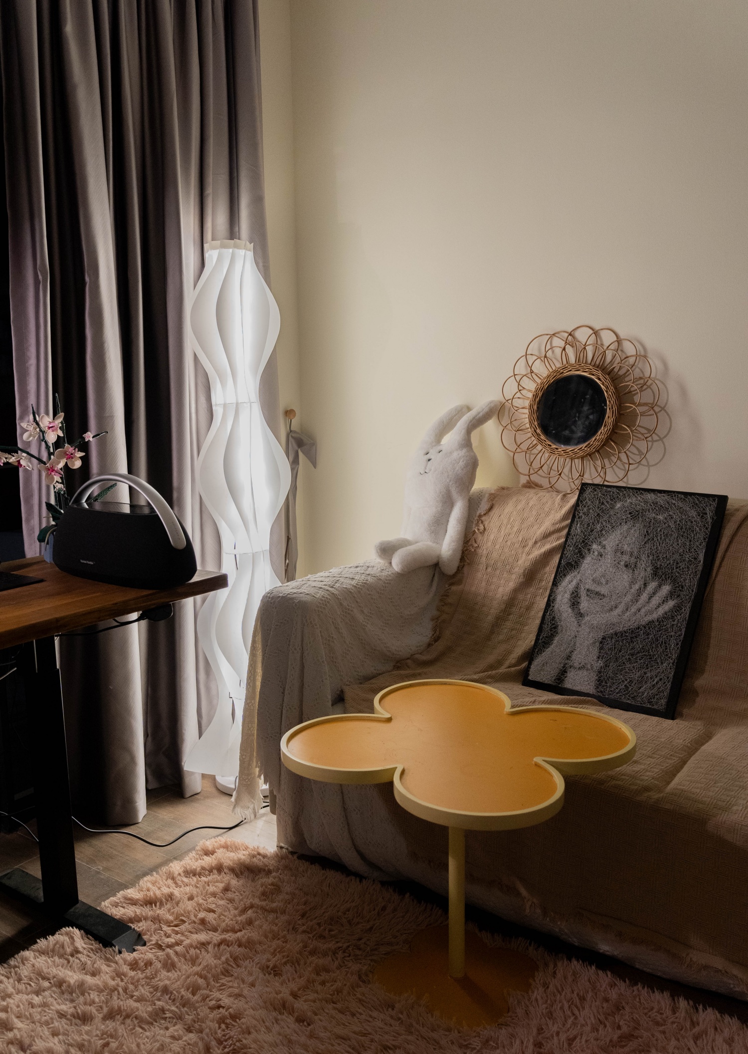Không gian góc làm việc lên đèn vào buổi tối. Thay vì bật đèn chiếu tổng thể, Phương sử dụng nhiều nguồn ánh sáng tập trung từ đèn bàn, đèn góc phòng.