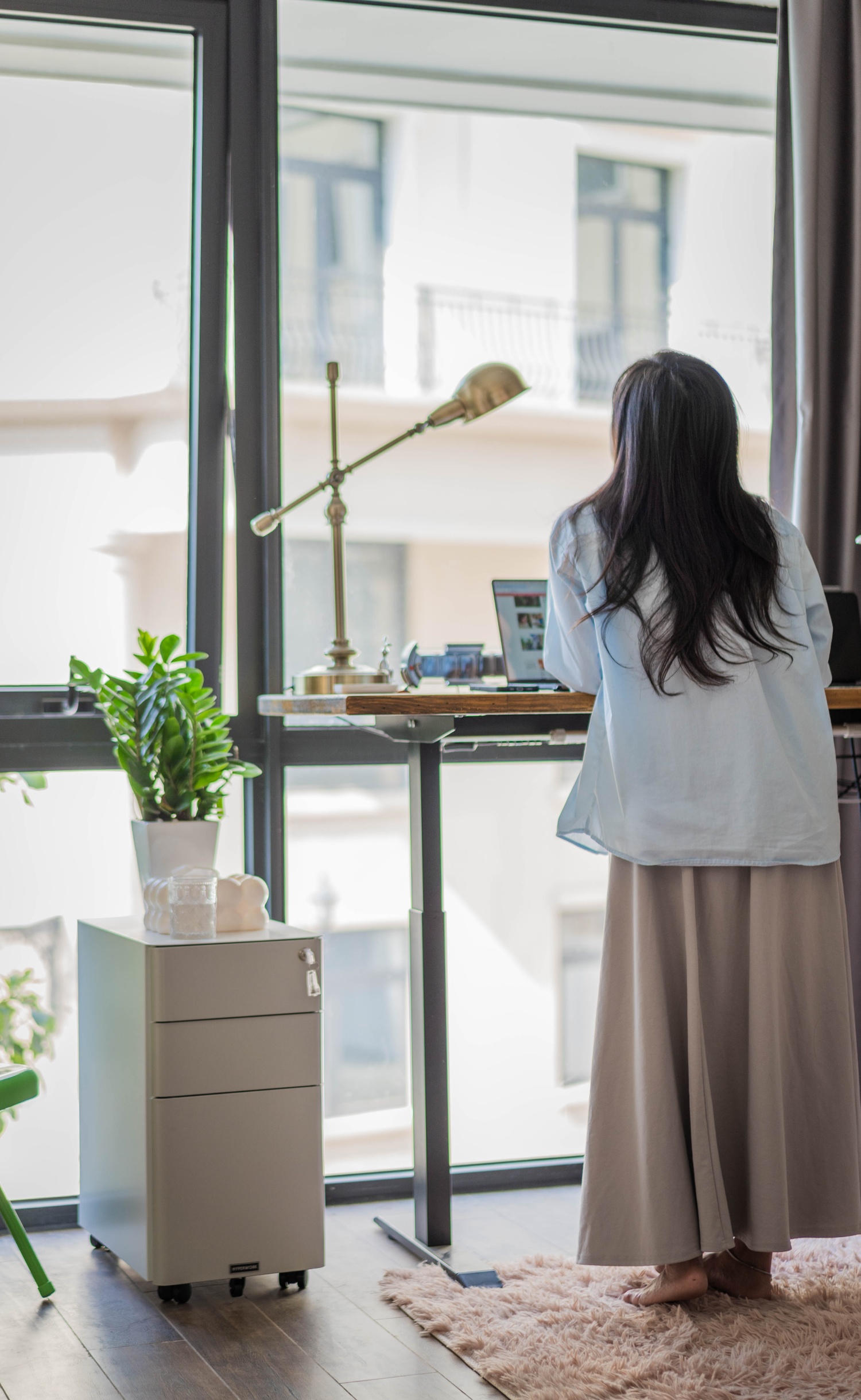 Bàn nâng hạ để Phương có thể thay đổi tư thế khi làm việc, chán ngồi thì có thể chuyển qua đứng chẳng hạn.
