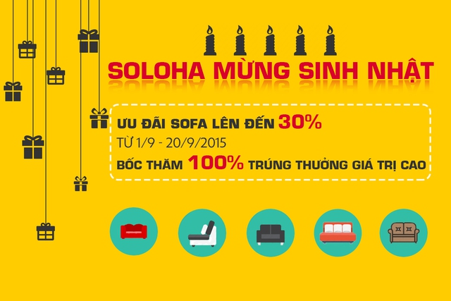 Đây là chương trình thường niên hàng năm của Soloha, và là chương trình ưu đãi lớn nhất trong năm mà Soloha đem đến cho khách hàng mua sắm nội thất, sofa, bàn ghế nhân dịp sinh nhật. Trong thời gian tổ chức diễn ra chương trình từ ngày 01/9 – 20/09/2015, khách hàng sẽ nhận được mức giảm giá trực tiếp từ 10 – 30% sofa. Giảm sâu lên đến 50% với các dòng sản phẩm thảm trải sàn, bàn trà và kệ tivi trực tiếp vào tổng giá trị đơn hàng.