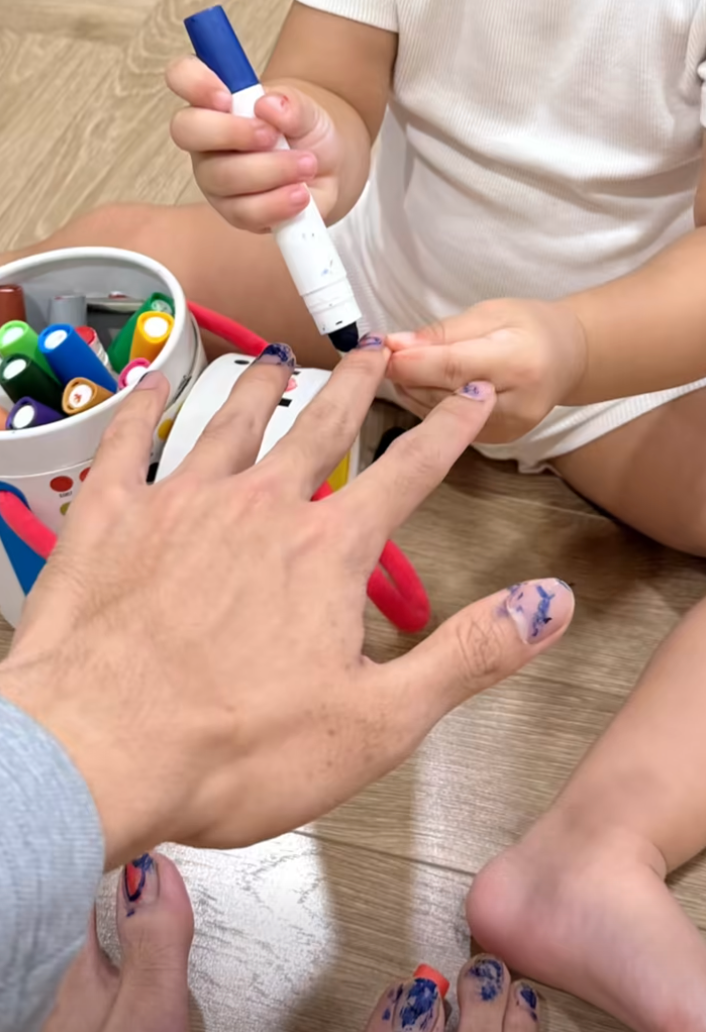 Không cần son môi hay phấn má cầu kỳ, công chúa nhỏ Rosa chọn một "mặt trận" khác để thể hiện khả năng sáng tạo, đó là… bộ móng tay của ba. Sơn móng đủ màu, đủ kiểu, mỗi ngón một phong cách, nhìn vào là biết ngay tác giả là một nghệ sĩ nhí đầy cảm hứng.