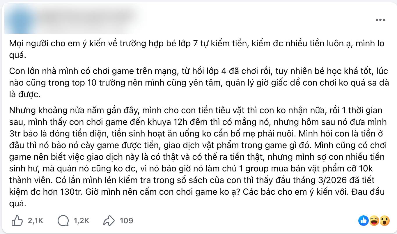 Mới đây, một người mẹ tại Hà Nội đã đăng tải dòng trạng thái đầy lo âu lên mạng xã hội về trường hợp của con trai mình. Theo đó, dù mới là học sinh lớp 7 nhưng cậu bé đã có khả năng tự chủ tài chính đáng kinh ngạc. Bài chia sẻ nhanh chóng thu hút hàng nghìn lượt tương tác và tạo ra những cuộc tranh luận nảy lửa về việc định hướng cho trẻ em kiếm tiền sớm.