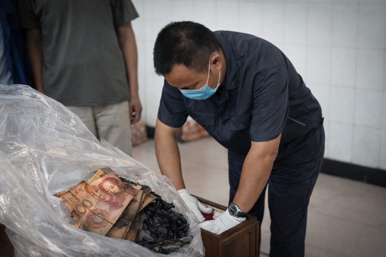Trong quá trình hỏa táng, nhân viên phát hiện trên thi thể của người cha có hàng trăm tờ tiền đã cháy xém.