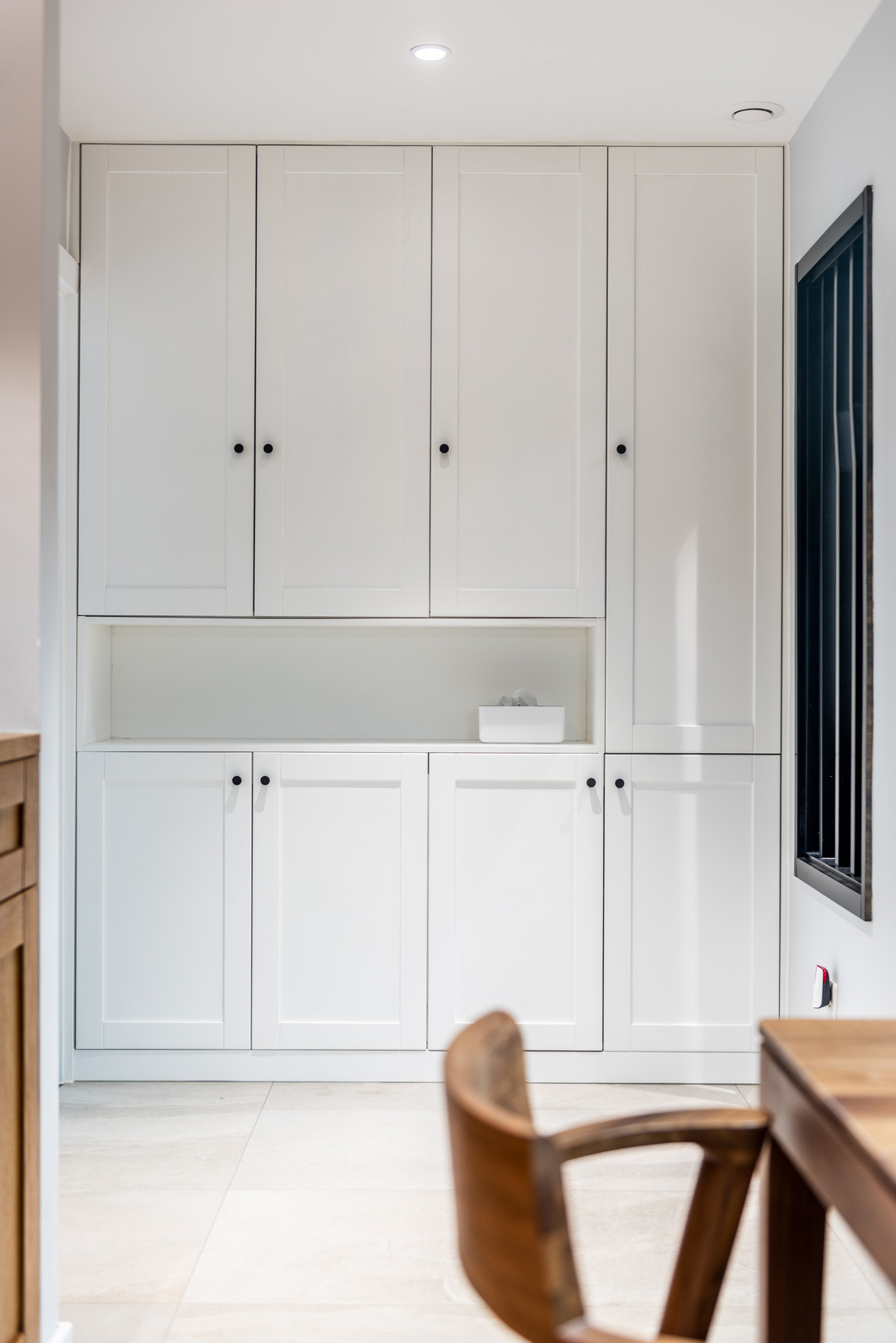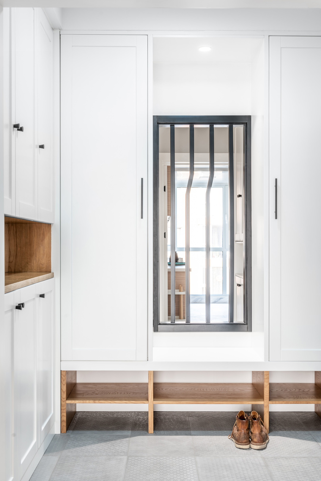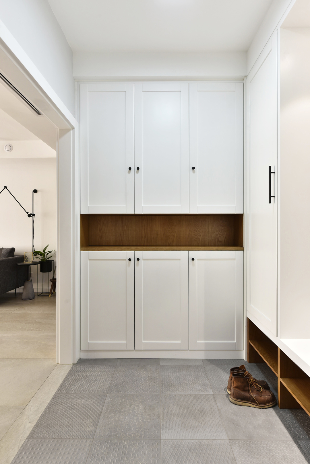Lối vào được thiết kế thêm hệ tủ vừa tạo sự riêng tư vừa tăng không gian lưu trữ. Một chi tiết đáng chú ý là khu vực thay giày được bố trí dạng ghế ngồi thấp, giúp người lớn tuổi dễ dàng sử dụng mà không phải cúi người nhiều lần.
