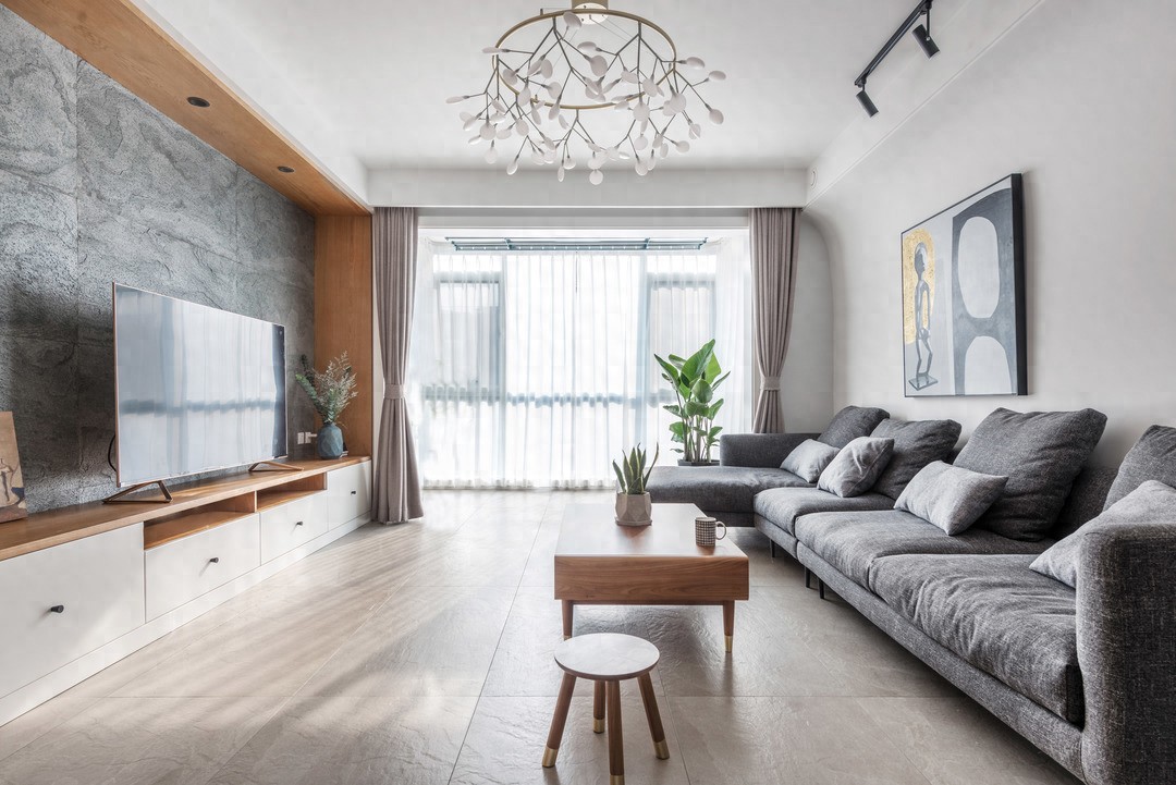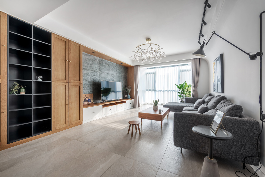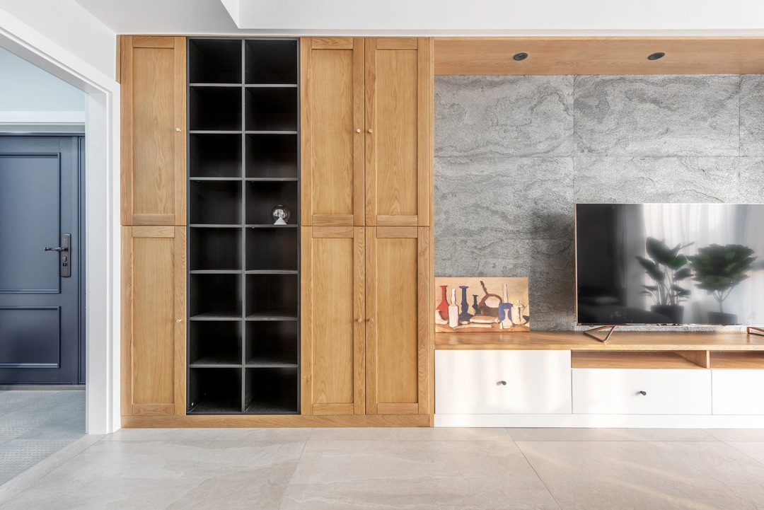 Hệ tủ tường kéo dài toàn bộ khu vực TV giúp tăng khả năng lưu trữ, hạn chế việc phải mua thêm đồ nội thất trong tương lai. Thiết kế “8 phần ẩn – 2 phần mở” giúp không gian không bị nặng nề dù có nhiều tủ chứa đồ.