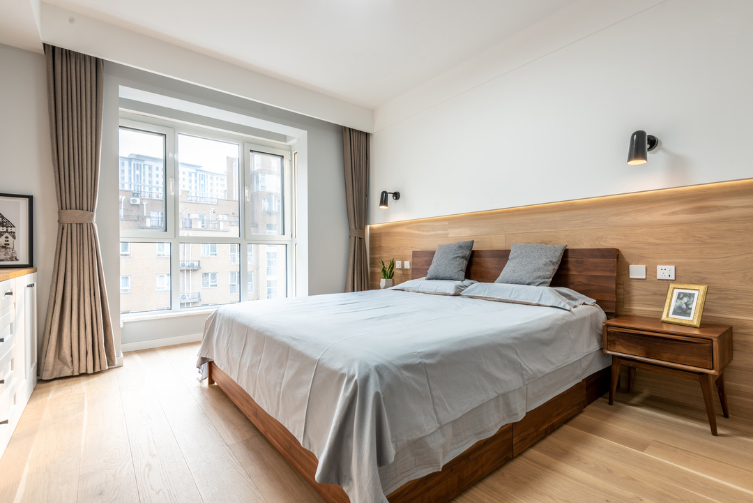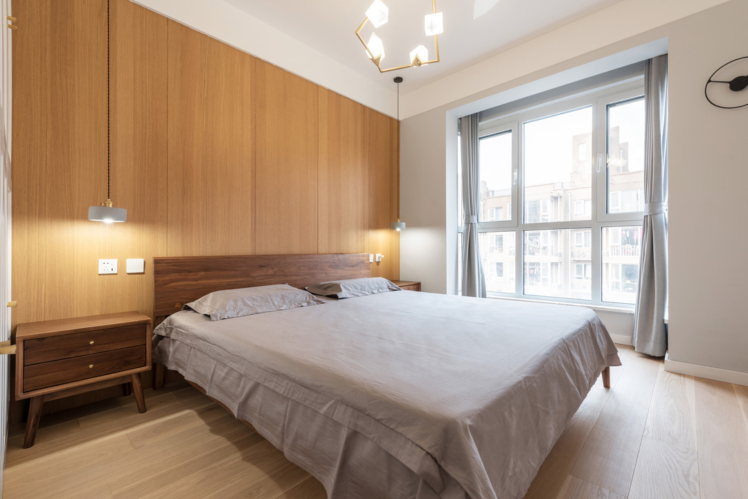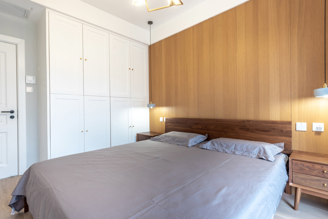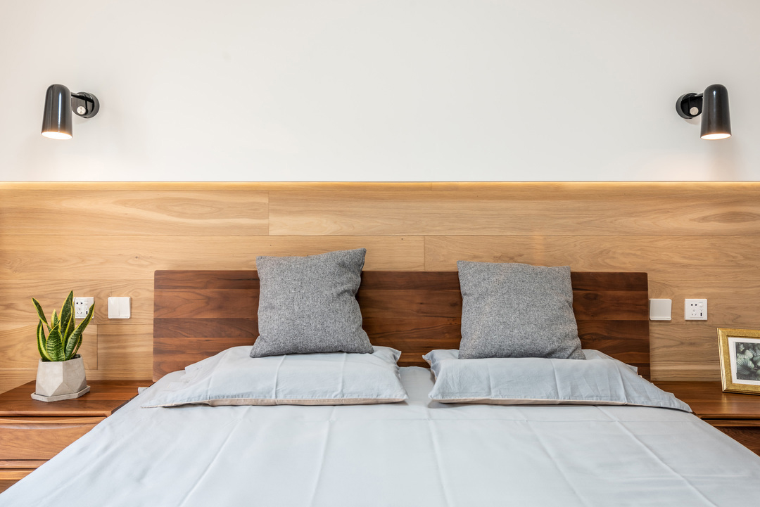 Phòng ngủ của cha mẹ được thiết kế đơn giản, sử dụng ánh sáng ấm để tạo cảm giác thư giãn.