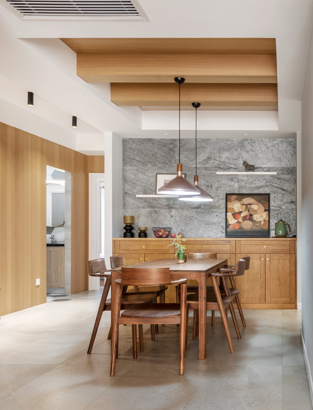 Ngoài ra, hệ thống thông gió được giấu trong trần nhà giúp duy trì chất lượng không khí mà không làm giảm chiều cao trần – một chi tiết thường thấy trong các thiết kế hướng đến sức khỏe.