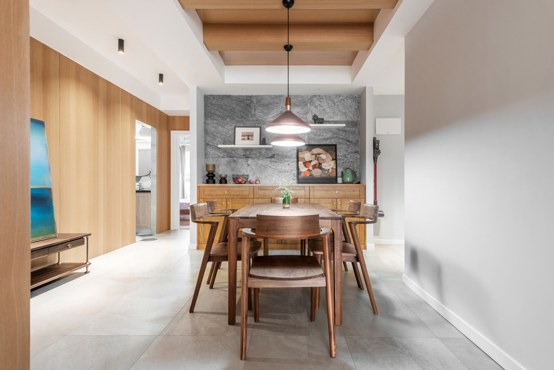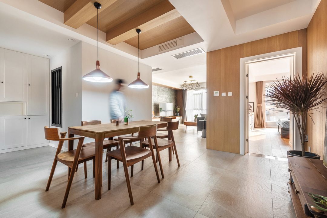 Phòng ăn được bố trí bàn dài đủ cho 3 thế hệ cùng dùng bữa. Không gian sử dụng vật liệu thân thiện môi trường, giúp đảm bảo sức khỏe lâu dài cho người cao tuổi.