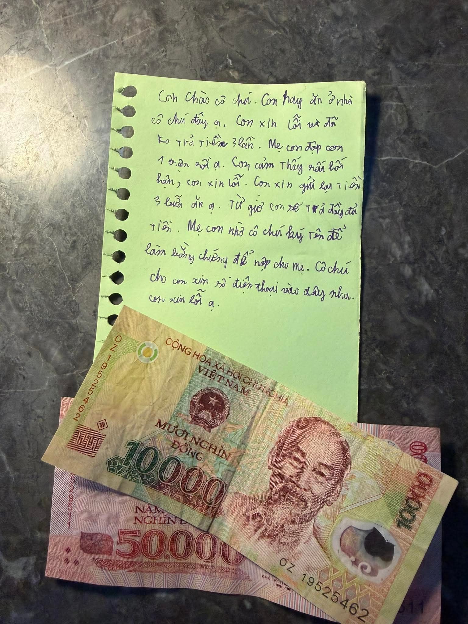 Và rồi cậu bé phải nhận một trận đòn nhớ đời, kèm lời nhắc: mẹ đã dạy không được lấy đồ của người khác mà vẫn dám làm.Bức ảnh chị đăng kèm theo là tờ giấy con viết lời xin lỗi gửi “cô chú”, trong đó cậu bé thừa nhận lỗi, xin giữ lại tiền 3 lần ăn quỵt để từ giờ tự đi trả dần, và nhờ cô chú ghi số điện thoại để mẹ tiện liên hệ. Bên dưới là tờ 100.000 đồng và 50.000 đồng đặt ngay ngắn.