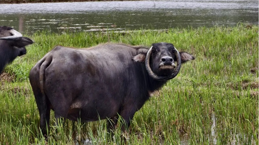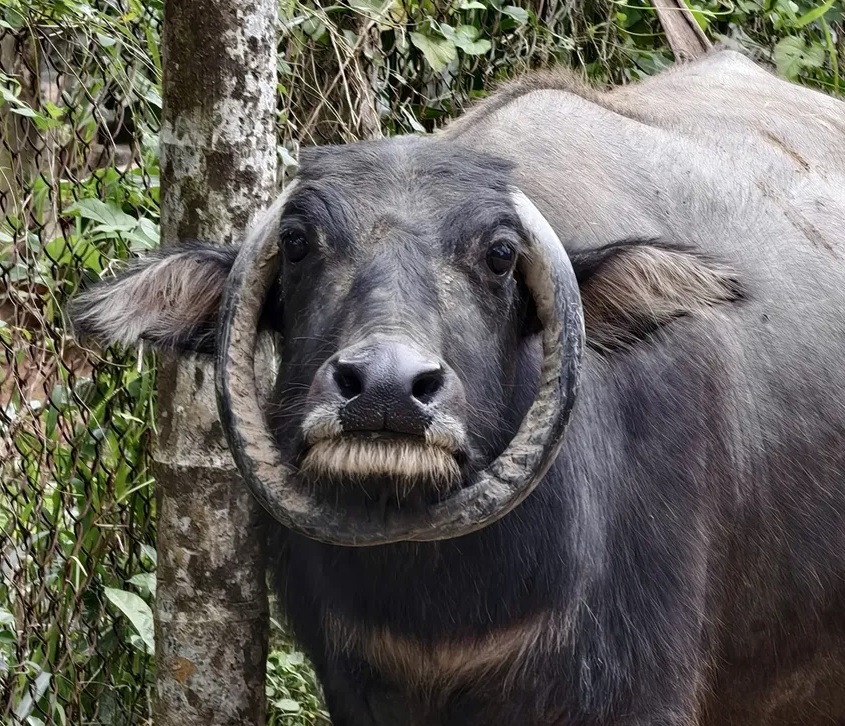 Những hình ảnh về con trâu có cặp sừng ôm trọn mặt này khiến người xem không khỏi thích thú.