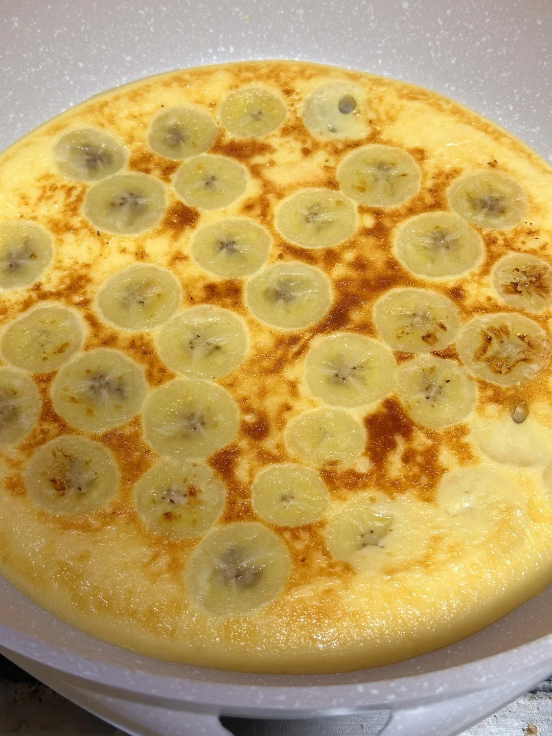 Khi đổ vào chảo, mẹ sẽ thấy những bong bóng nhỏ li ti nổi lên, đó là lúc bánh đang chín dần và lan tỏa mùi thơm ngào ngạt của chuối chín. Bánh có độ mềm mướt như bánh pudding, vị ngọt tự nhiên thanh tao, rất giàu kali và canxi, đảm bảo bé sẽ chủ động cầm ăn mà không cần mẹ phải giục.