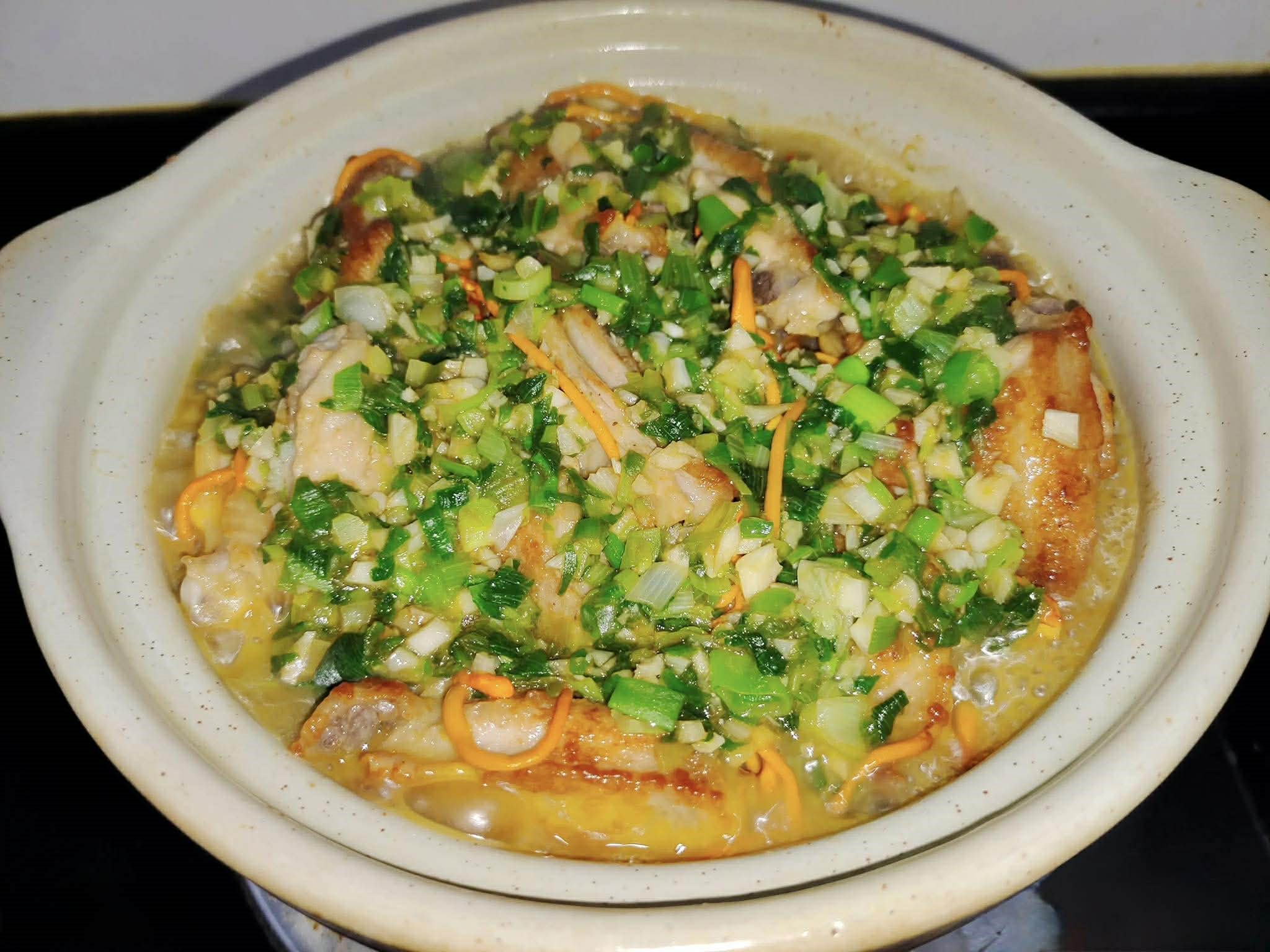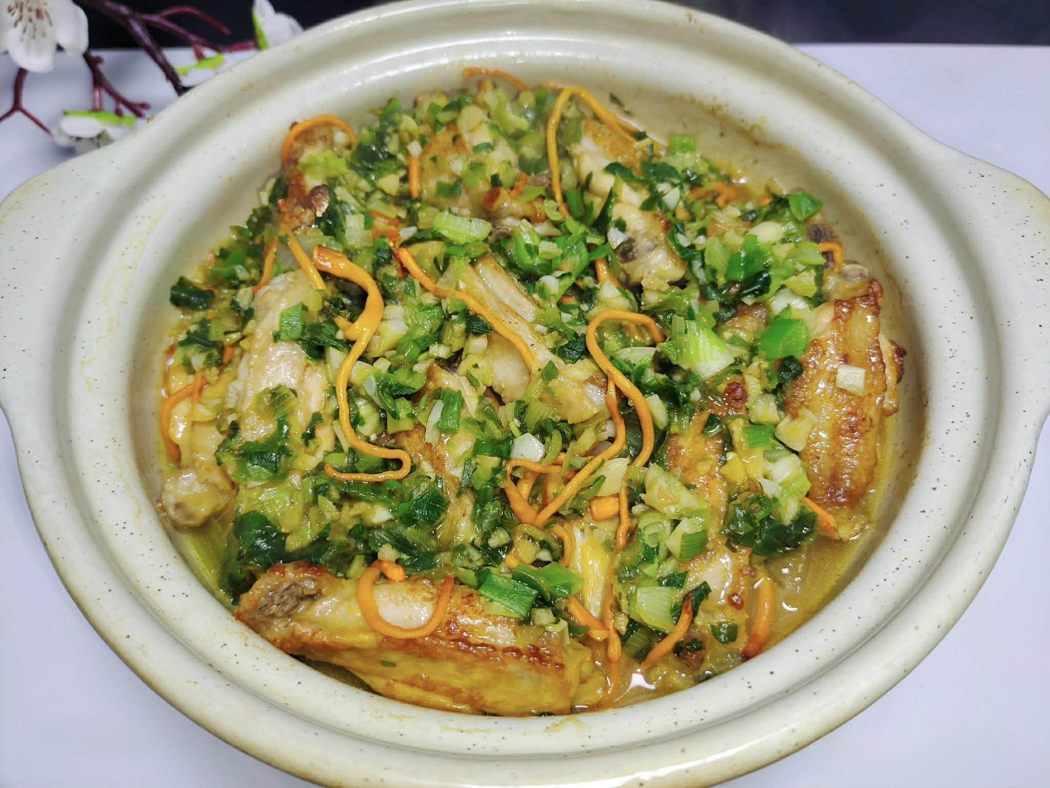 Món ăn hôm nay có các nguyên liệu chính gồm cánh gà, nấm đông trùng hạ thảo, hành lá và tỏi. Bí quyết của món ăn này nằm ở hương vị hành lá đậm đà. Đầu tiên, chiên sơ cánh gà, sau đó ninh trong nồi đất với hành lá. Cánh gà sẽ ngấm hương vị hành lá, trở nên mềm và ngon hơn. Thêm nấm đông trùng hạ thảo càng làm tăng giá trị dinh dưỡng và làm phong phú thêm hương vị. Chắc chắn đáng để thử.