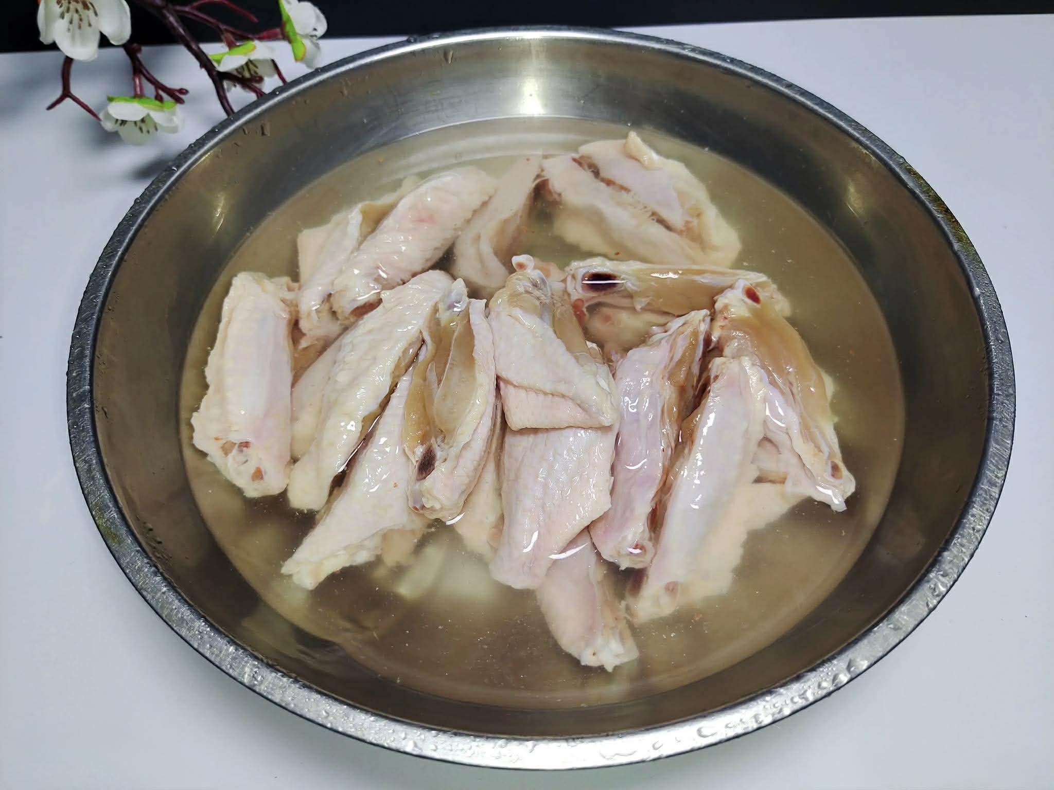 Cánh gà không cần chần, nhưng phải ngâm trong nước lạnh để giúp loại bỏ bớt máu và giảm mùi tanh. Ngâm cánh gà sau khi đã chặt nhỏ cũng sẽ cho kết quả tốt hơn.