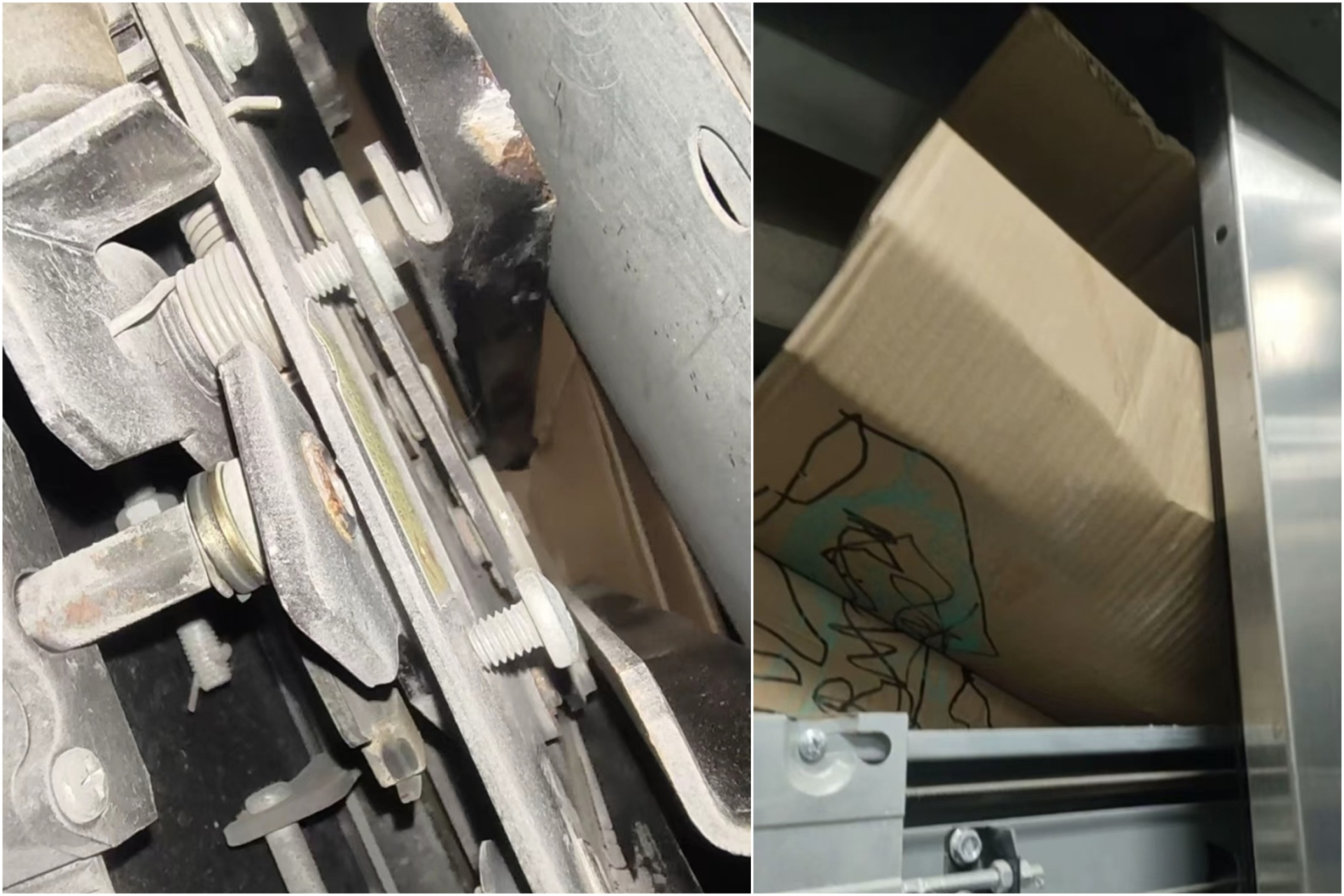 Hình ảnh những tấm bìa mắc kẹt dưới sàn thang máy