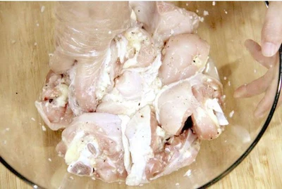 Rửa lại thịt gà với nước lã sau đó ướp với 1 muỗng cafe muối, ½ muỗng cafe hạt tiêu cùng với 1 muỗng canh rượu gạo, 2 muỗng canh tỏi băm nhỏ trong vòng 30 phút. |