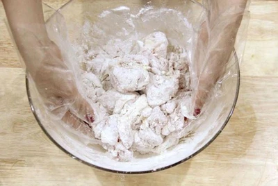 Trộn các nguyên liệu phần hỗn hợp bột phủ sau đó cho thịt gà vào xóc đều. |