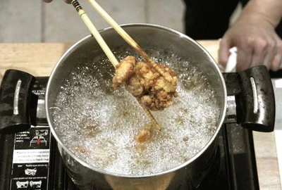 Bắc chảo thật ngập dầu, khi dầu đã nóng đều thì cho gà vào rán. Khi lớp vỏ vàng đều thì thịt gà đã chín, các bạn gắp ra, để ráo dầu nhé! |