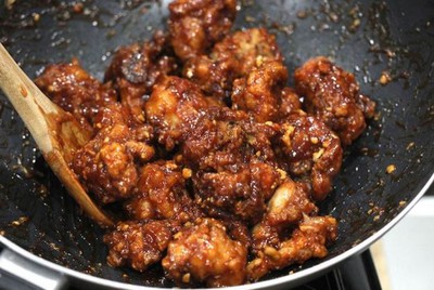 Cuối cùng bạn cho thịt gà rán vào trộn đều với hỗn hợp nước xốt ở lửa vừa. Khi nước xốt đã quyện đều vào gà thì tắt lửa, rắc đậu phộng lên và thưởng thức! |