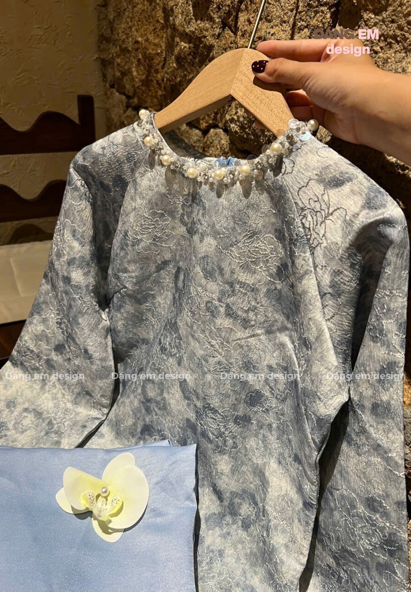 Thêm một điểm khác biệt khiến chị em đốn tim ngay từ lần đầu ngắm nhìn. Chính là chất liệu gấm hoa loang vân nhũ nhẹ nhàng điểm xuyết, chất liệu cũng giúp mẫu áo đứng dáng hơn khi diện.
