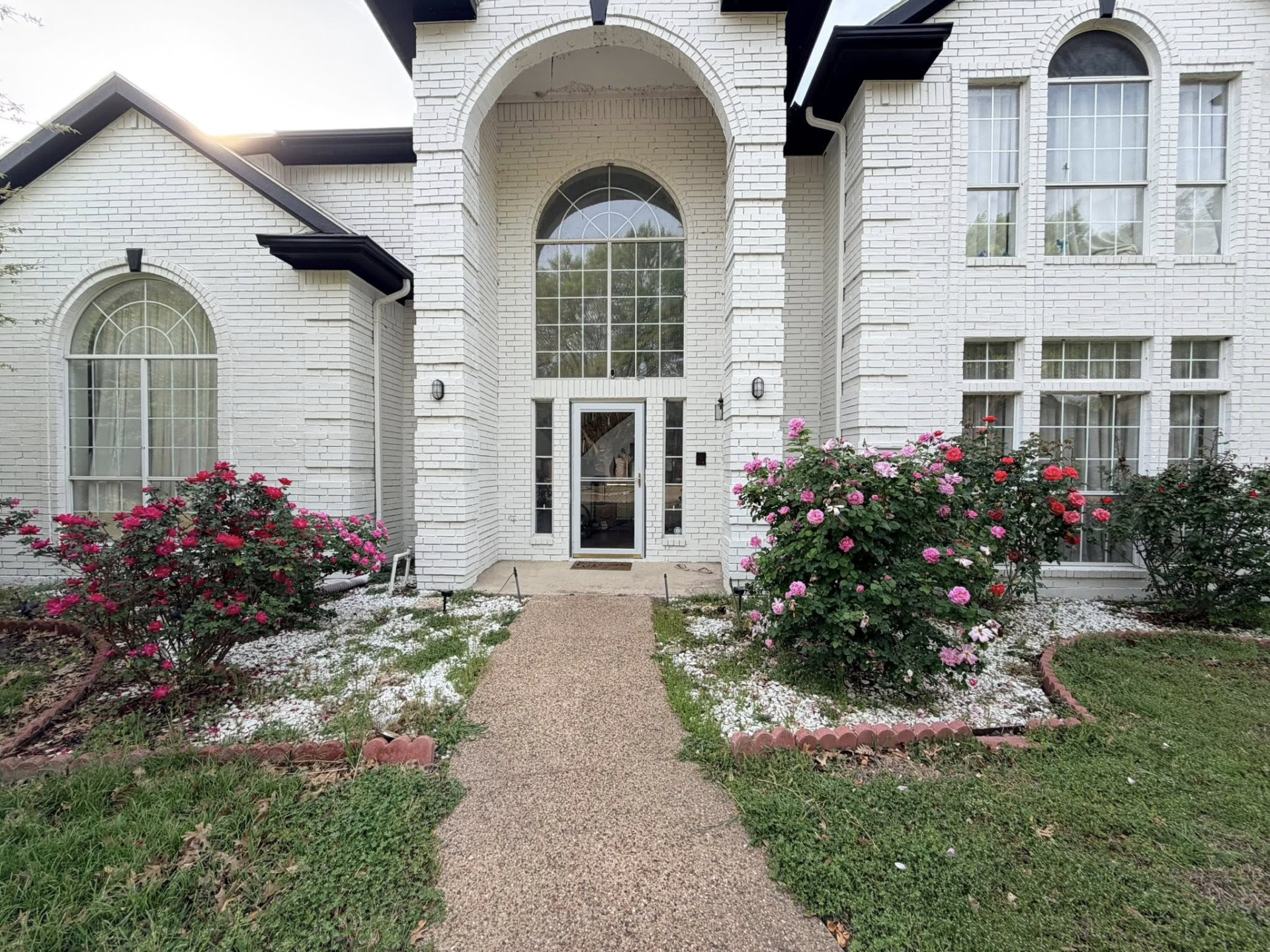 Khu vườn phía trước được chăm chút với nhiều khóm hoa hồng nở rực rỡ, tạo không gian lãng mạn. Sân vườn rộng, nhiều cây xanh, đủ để trồng hoa, chăm cỏ và thư giãn. Tổng thể mang lại cảm giác yên bình, thoáng đãng, đúng chất cuộc sống an nhiên nơi xứ người.