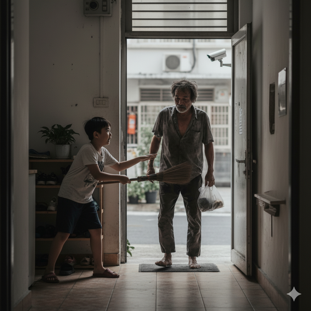 Gần đây, một nhóm cư dân ở quận Panyu (Quảng Châu) bỗng chốc náo loạn chỉ vì một bức ảnh: trước cửa một căn hộ, một người vô gia cư đứng chặn trước thềm; bên trong, đứa trẻ cầm chổi như đang cố “xua đuổi” kẻ lạ. Phụ huynh đăng ảnh lên nhóm, hoảng hốt thông báo rằng đứa con 12 tuổi ở nhà một mình đã gặp… kẻ đột nhập.