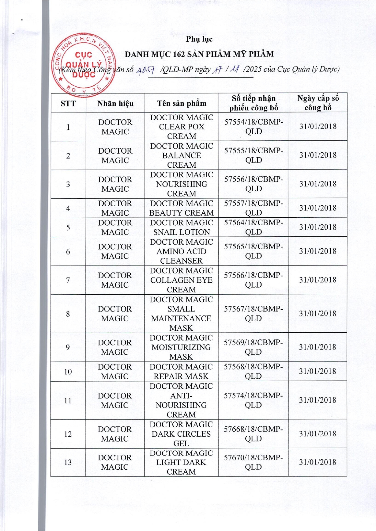 Đối với 162 sản phẩm đã được cấp số tiếp nhận phiếu công bố sản phẩm mỹ phẩm mà Công ty chịu trách nhiệm đưa ra thị trường đề nghị cung cấp đầy đủ báo cáo về hồ sơ thông tin sản phẩm tương ứng. Đề nghị Công ty gửi toàn bộ báo cáo về Cục Quản lý Dược trước ngày 21/11/2025.