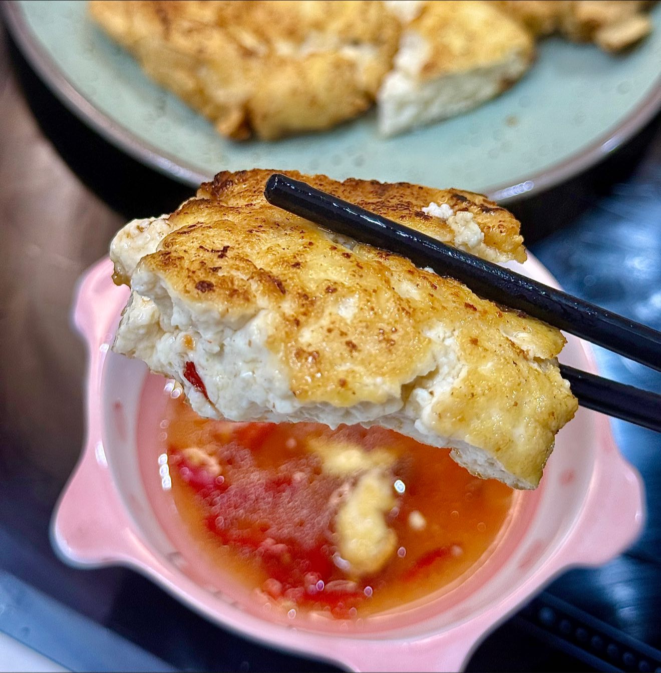 Đậu phụ rán từ lâu đã là món “quốc dân”, trẻ con ăn được, người già thích, bữa cơm vội hay mâm cơm đủ món đều có thể chen thêm đĩa đậu rán chấm mắm tỏi ớt là xong. Thế nhưng kiểu đậu phụ đập dập rồi rán lại mang đến một trải nghiệm rất khác. Thay vì cắt miếng vuông vức, người ta để nguyên bìa đậu mơ, dùng tay hoặc thìa ấn cho dập nhẹ, nứt nẻ, rồi đem rán trong mỡ nóng. Nhờ những vết nứt nhỏ này, bề mặt đậu có nhiều “ngóc ngách”, khi rán lên sẽ xù xì, giòn dai hơn, đồng thời bên trong vẫn giữ được độ mềm, ẩm và béo.
