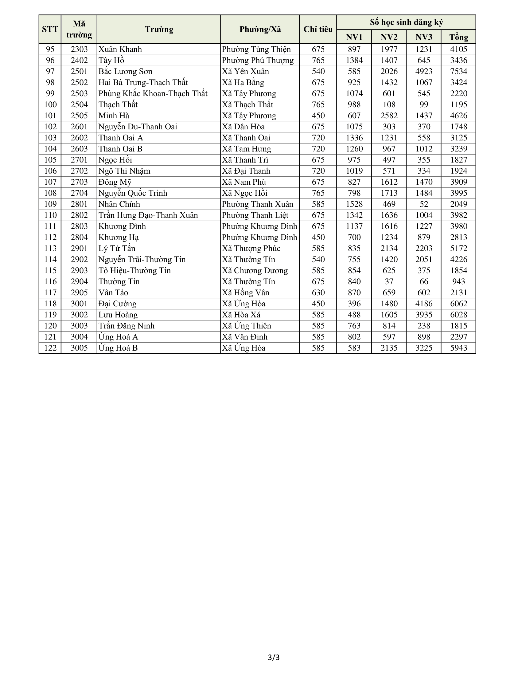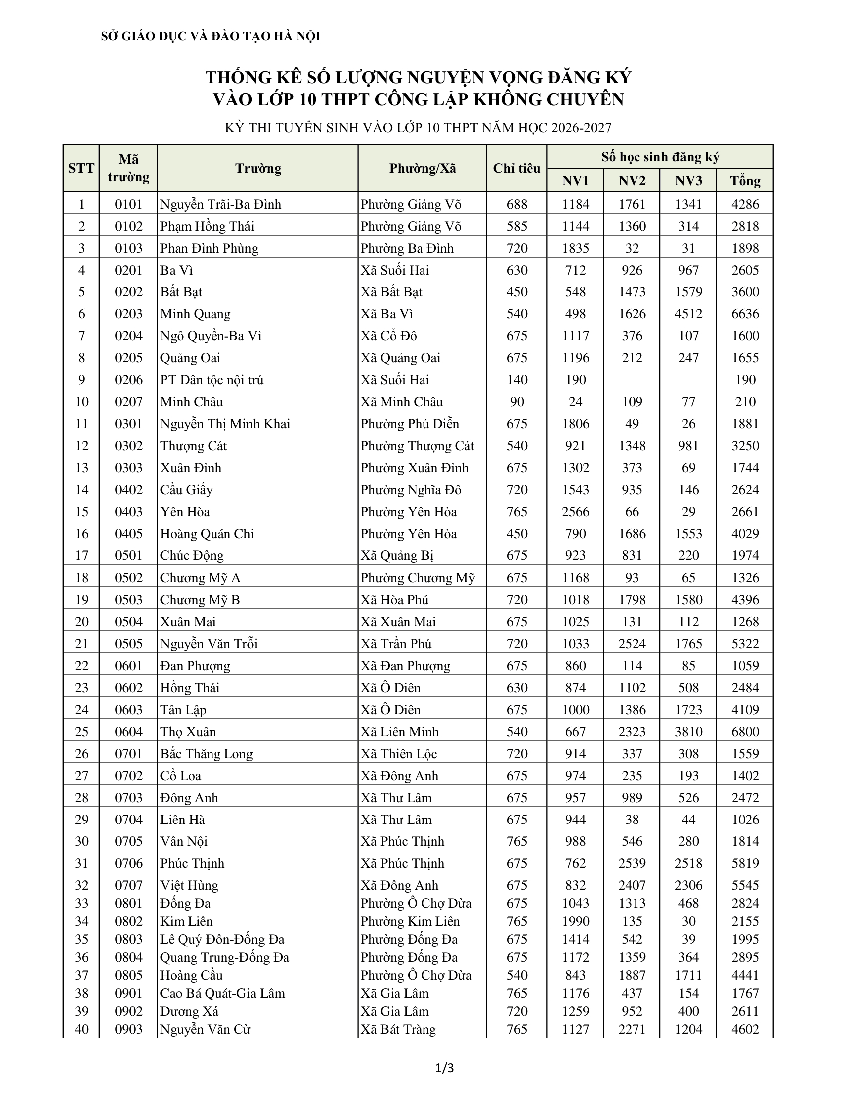 Chi tiết số lượng học sinh đăng ký vào từng trường trung học phổ thông công lập không chuyên và chỉ tiêu từng trường: