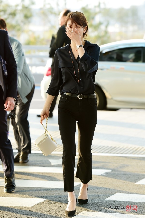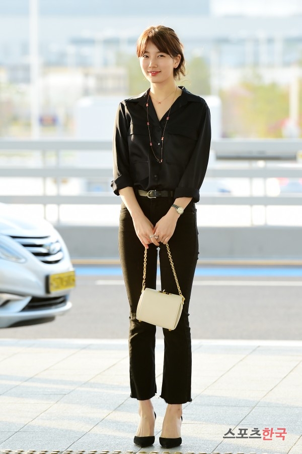 Diện một bộ cánh toàn tông màu đen nhưng Suzy trông không hề "dừ". Sự kết hợp giữa áo sơ mi lụa và quần ống đứng, xuyệt tông màu đen đã tạo nên bộ cánh trang nhã, sang trọng. Những điểm nhấn như thắt lưng da, vòng cổ hay giày cao gót mũi nhọn giúp outfit thêm trẻ trung, hiện đại, bớt sự đơn điệu. Ngoài ra, Suzy còn gợi ý kiểu tóc hoàn hảo để áp dụng khi diện những bộ cánh tối giản, đó là tóc búi messy.