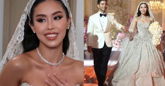 Váy cưới của Tiên Nguyễn được đặt thiết kế riêng ở nước ngoài rồi vận chuyển về Việt Nam Trong tiệc cưới, Tiên Nguyễn xuất hiện lộng lẫy với chiếc váy cưới đính hàng nghìn viên pha lê và đá quý, được thiết kế riêng theo đúng tinh thần Bridal Couture của Jimmy Choo.