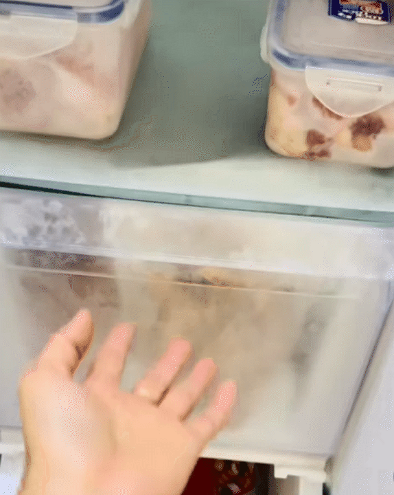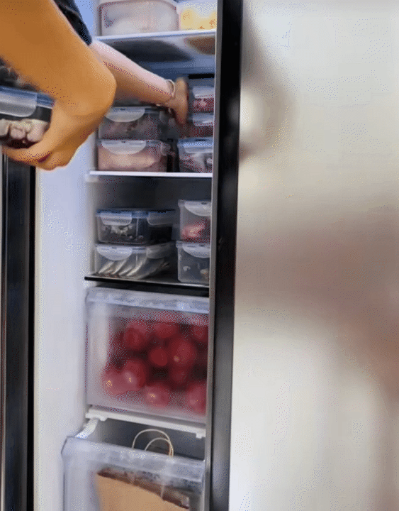 Chiếc tủ lạnh trong gia đình cô không chỉ là nơi bảo quản thực phẩm mà còn giống như một "trợ lý" đắc lực. Mọi thứ được sắp xếp ngăn nắp, khoa học: Đồ khô ở cánh tủ, thịt cá ở các ngăn dưới, thực phẩm đóng túi nằm gọn trong ngăn kéo. Ngay cả cà chua hay dứa cũng được cô cấp đông để tiện sử dụng, giúp việc nấu ăn trở nên nhanh chóng mà vẫn giữ được hương vị.