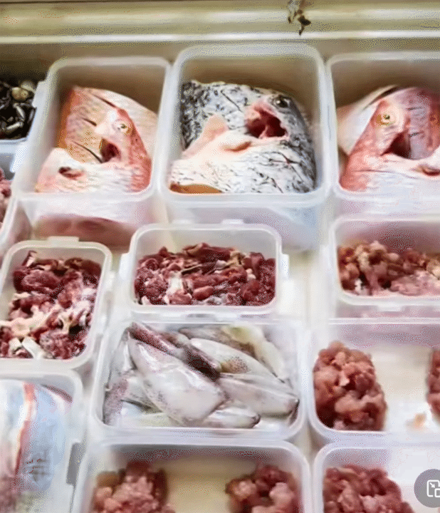 "Cá thịt khi mua về mình sẽ rửa sạch, sát muối, chanh, sau đó cắt thành từng miếng nhỏ rồi chia vào từng hộp, mỗi hộp đủ nấu một bữa ăn cho cả nhà. Có một số món mình sẽ sơ chế trước. Đóng hộp cẩn thận, nếu bạn không nhớ thì có thể dán nhãn để phân biệt. Còn mình quen rồi nên xếp các hộp giống nhau vào cùng một bên. Tôm mực sẽ ưu tiên ăn trước, rồi đến thịt gà vịt ăn sau, trứng để dành cho những bữa nhỏ" - người vợ chia sẻ.