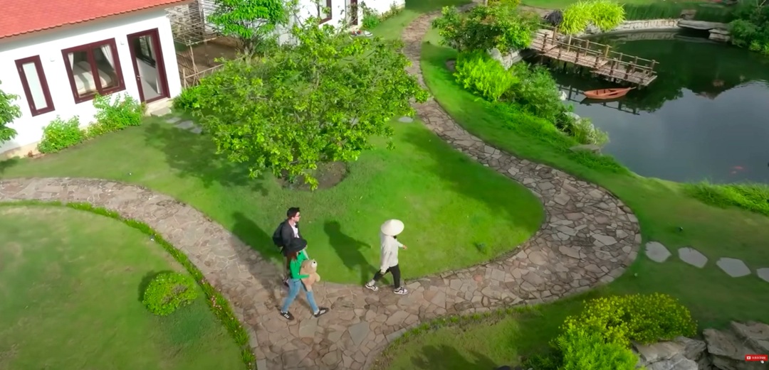 Bên trong khuôn viên là hồ cá Koi quy mô, khu vườn rộng rãi trồng nhiều loại cây trái, cùng khu nhà chính hiện đại với thiết kế tinh tế. Không gian vừa sang trọng, vừa gần gũi thiên nhiên, trở thành chốn nghỉ dưỡng lý tưởng cho gia đình nhỏ.