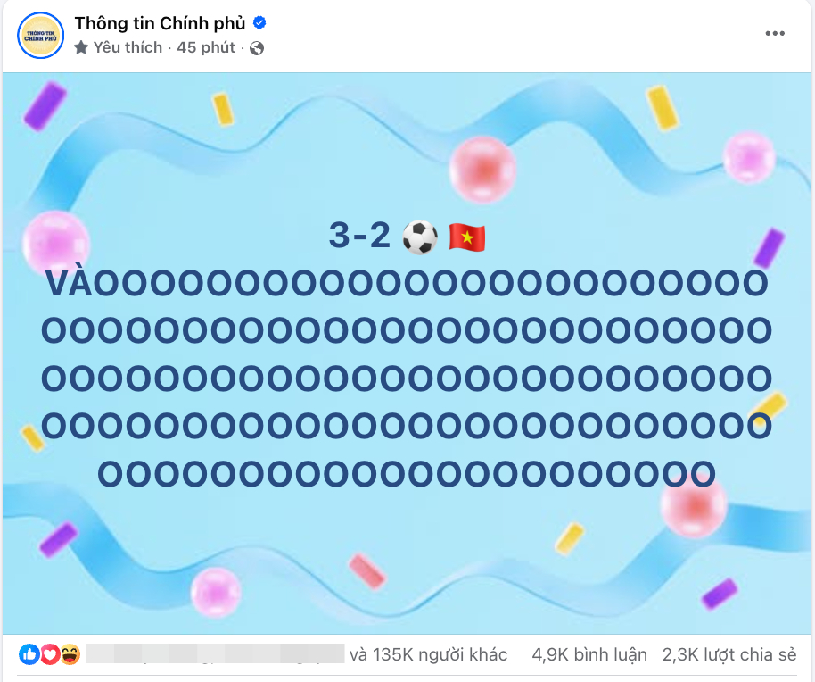 Theo đó, không ít người bày tỏ đây là lần hiếm thấy Fanpage Thông tin Chính phủ cập nhật liên tục như vậy trong đêm. Bởi một phần do diễn biến của trận đấu nhanh, một phần do các cầu thủ Việt Nam quá xuất sắc khi cách vài phút lại có một bàn thắng đẹp mắt, mở tỷ số và giành chiến thắng. Các bài đăng đều ngắn gọn, chỉ một dòng status cảm thán, chia sẻ niềm vui nhưng đều thu về lượng tương tác rất lớn.