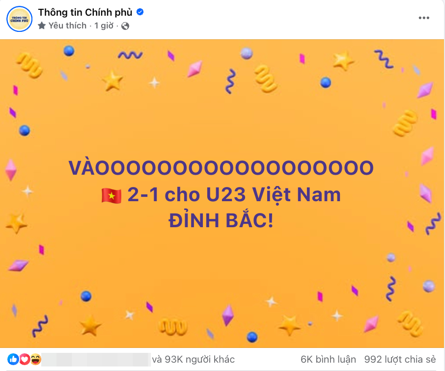 Điều hiếm thấy từ Fanpage Thông tin Chính phủ trong đêm U23 Việt Nam làm nên lịch sử trước UAE