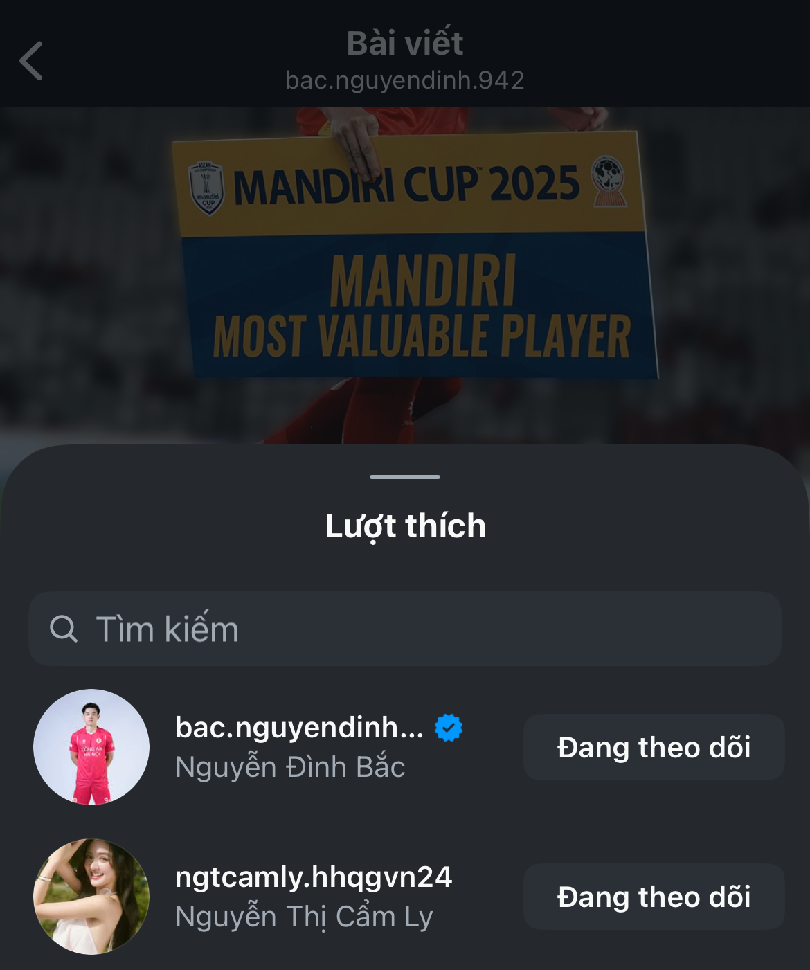 Đình Bắc thả tim cho Cẩm Ly nhưng hiện đã gỡ (Ảnh chụp màn hìnn)