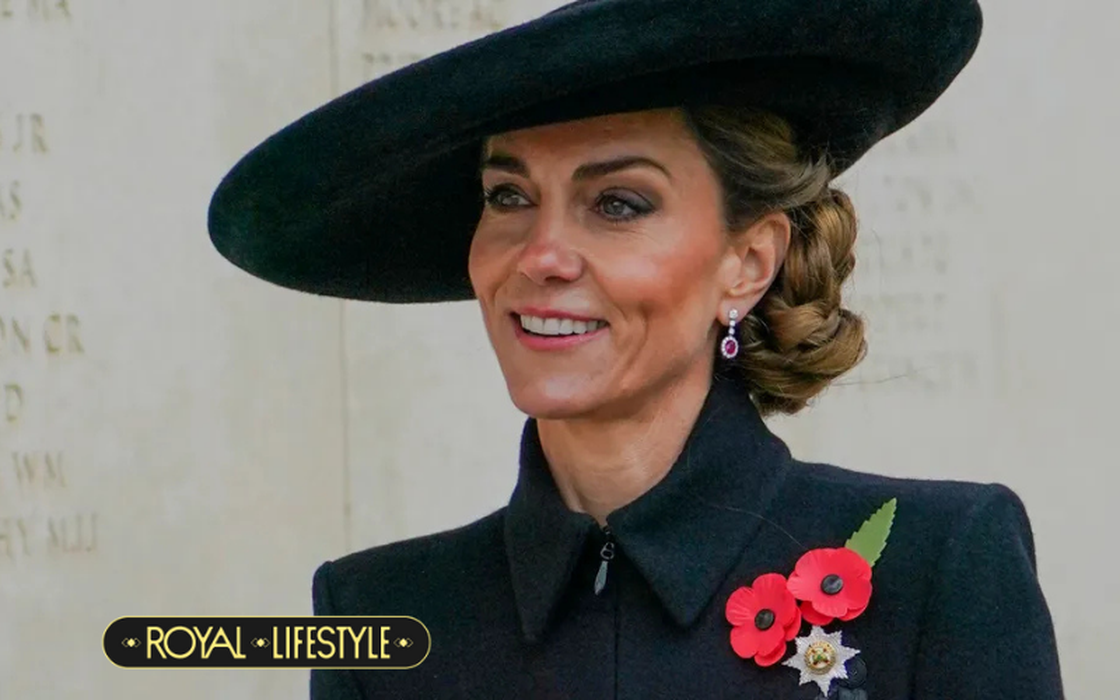 Trong sự kiện được tổ chức tại National Memorial Arboretum (Staffordshire, Anh), Vương phi xuất hiện trong bộ váy khoác màu đen thanh lịch của Catherine Walker cùng mũ Jane Taylor tông tiệp. Nổi bật trên nền trang phục trầm là đôi khuyên tai ruby và kim cương rực rỡ, như điểm sáng mang ý nghĩa sâu sắc cho ngày tưởng niệm các binh sĩ đã hi sinh.