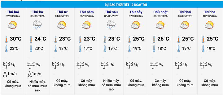 Hôm nay 1/3, Hà Nội mưa vài nơi, mưa dồn nhiều vào buổi sáng, trưa chiều giảm mây trời nắng. Gió đông nam đến nam cấp 2-3. Nhiệt độ thấp nhất 23-25°C, nhiệt độ cao nhất 29-31°C.