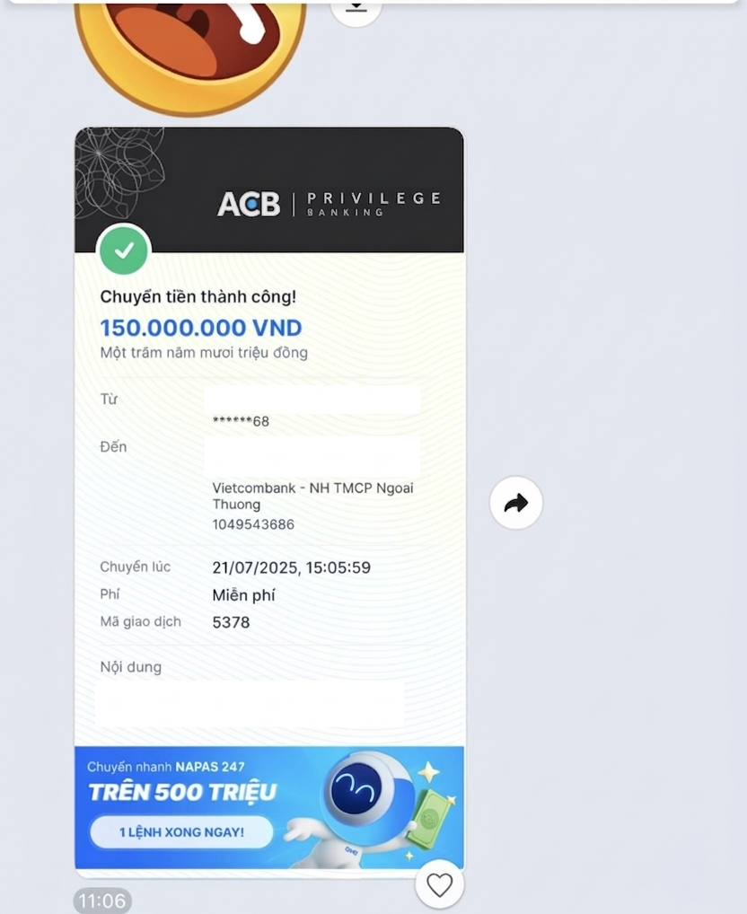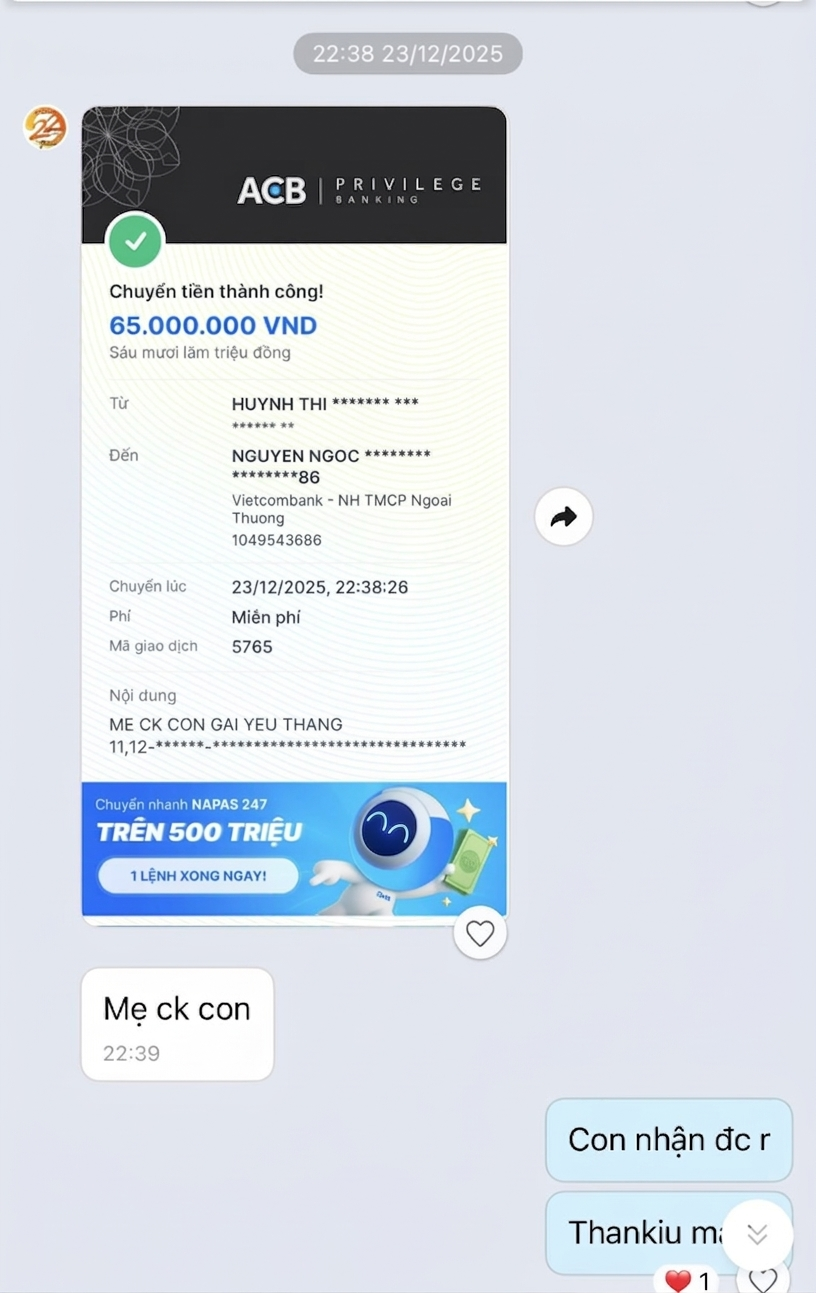 Đi kèm với đoạn tin nhắn là hàng loạt hóa đơn chuyển khoản lên đến hàng chục, thậm chí hàng trăm triệu đồng. Những con số ấy, khi đứng riêng lẻ, có thể chỉ là chi phí học tập. Nhưng khi đặt cạnh những lời nhắn “bố mẹ quen rồi”, “đừng lo cho bố” lại mang một ý nghĩa khác là sự hy sinh được giấu đi rất kỹ.