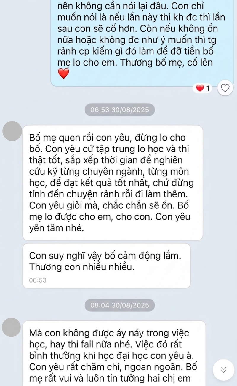 “Bố mẹ quen rồi con yêu, đừng lo cho bố… Con cứ tập trung học và thi thật tốt… Bố mẹ lo được cho em, cho con. Con yêu yên tâm nhé”, người bố nhắn nhủ.