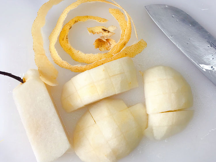 Bước 1: Lấy nửa củ cải trắng rửa thật sạch vỏ sau đó dùng dụng cụng bào lấy lớp vỏ ngoài (càng mỏng càng tốt, đừng để lạm vào quá nhiều phần thịt trắng). Gọt vỏ một quả lê đã được rửa sạch kỹ. Quất rửa sạch rồi bổ đôi, bỏ hạt.