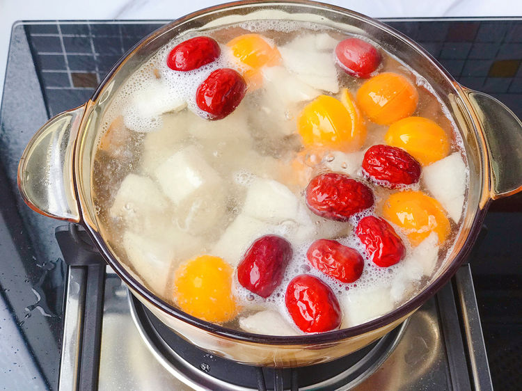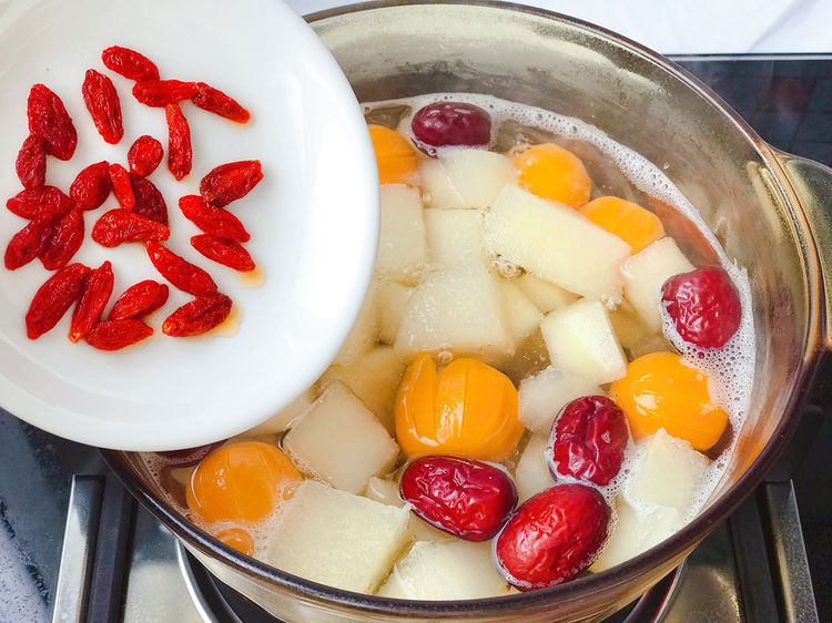 Bước 2: Cho tất cả các nguyên liệu (trừ kỷ tử) vào nồi, rồi thêm nước sao cho mực nước ngập các nguyên liệu khoảng hai đốt ngón tay. Đun sôi trên lửa lớn, sau đó giảm lửa nhỏ và nấu liu riu trong 30 phút, cho đến khi thịt quả lê trở nên trong suốt. Cuối cùng tắt bếp, rắc thêm kỷ tử vào, ủ thêm 5 phút nữa là có thể thưởng thức.