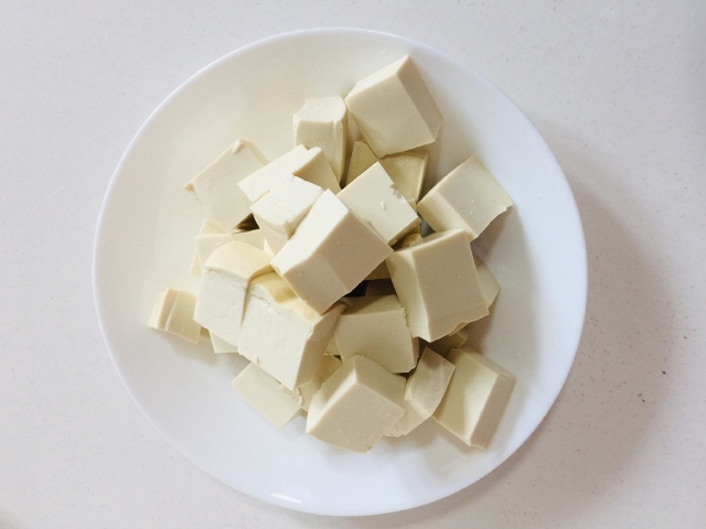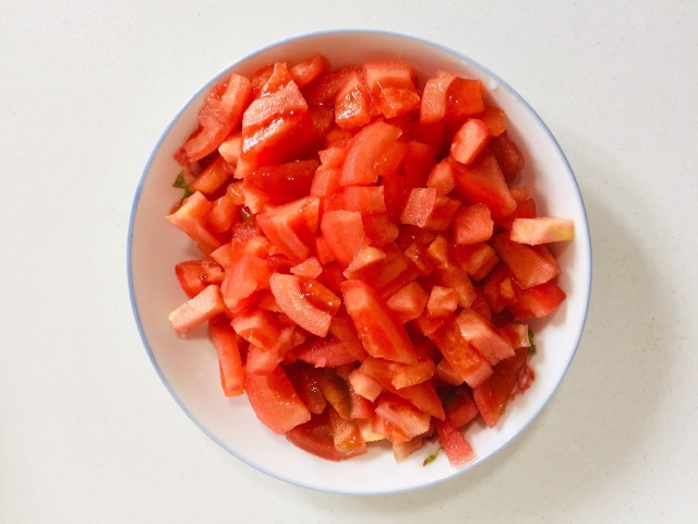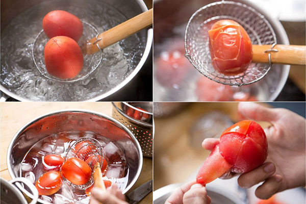 Bước 1: Khía hình chữ thập lên trên đầu quả cà chua, chần qua nước sôi, rồi vớt ra vỏ sẽ dễ bóc. Sau đó bạn cắt cà chua đã bóc vỏ thành những miếng nhỏ để có kết cấu tốt hơn sau khi nấm. Cắt đậu phụ thành lát dày hoặc khối nhỏ, rắc một chút muối và ngâm trong nước một lúc. Điều này giúp loại bỏ vị tanh của đậu và làm cho đậu phụ săn chắc hơn và ít bị vụn hơn. Đập trứng vào bát, thêm một chút muối và vài giọt nước, rồi đánh đều. Điều này sẽ giúp trứng trở nên bông xốp và mịn hơn.