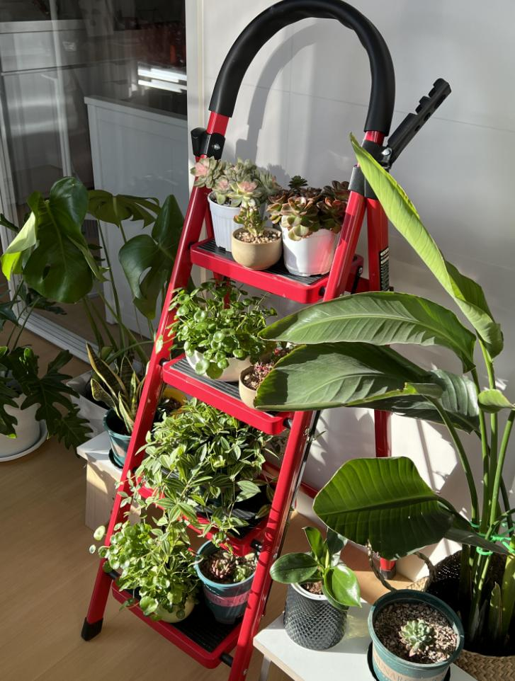 Một chiếc thang gấp thường chỉ được dùng khi cần sửa chữa, sau đó bị “bỏ quên” trong góc nhà. Nhưng nếu đặt thang cạnh tường, bạn có thể tận dụng các bậc để làm kệ cây, giá sách hoặc khu vui chơi cho mèo.