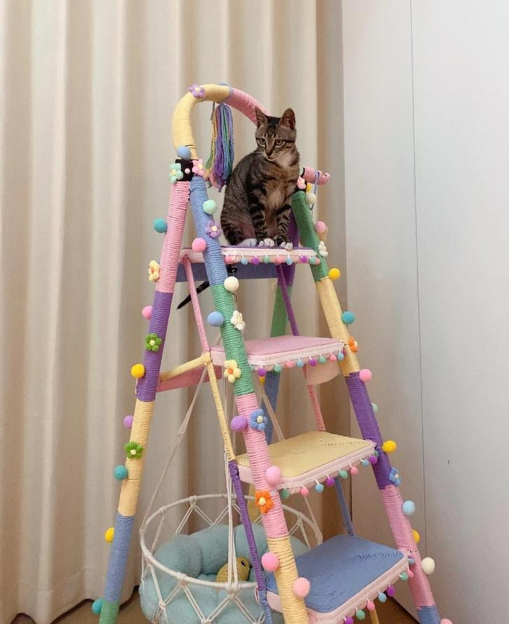 So với việc mua kệ trang trí hoặc trụ leo cho thú cưng, giải pháp này vừa tiết kiệm vừa tạo điểm nhấn thú vị cho không gian sống.