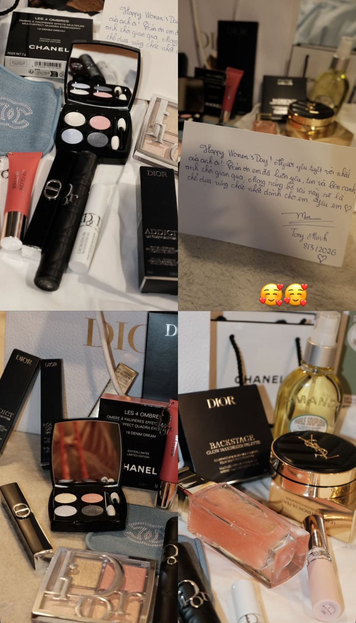 Võ Ngọc Trân khoe cả lố quà 8/3 từ bạn trai - Tony Minh. Anh chàng còn tự tay viết thiệp dành tặng nửa kia: “Happy Women's Day! Người yêu tuyệt vời nhất của anh ơi! Cảm ơn em đã luôn yêu, tin và bên cạnh anh thời gian qua. Mong rằng bờ vai này sẽ là chỗ dựa vững chắc nhất dành cho em. Yêu em”.