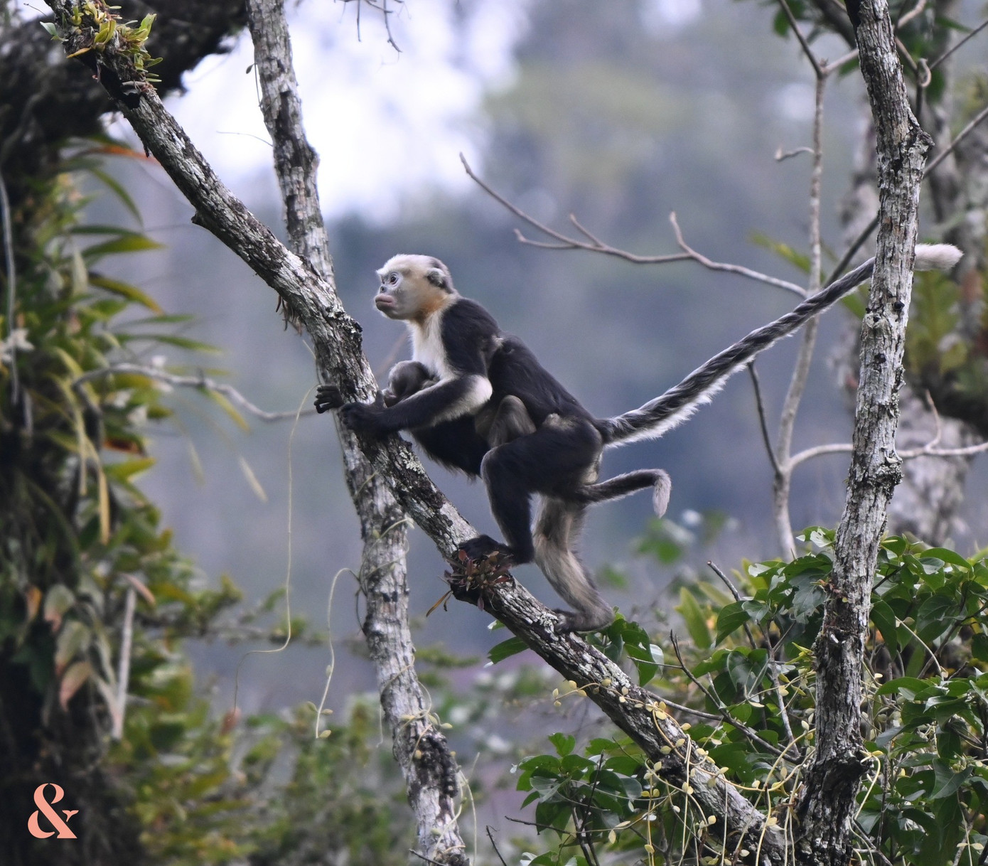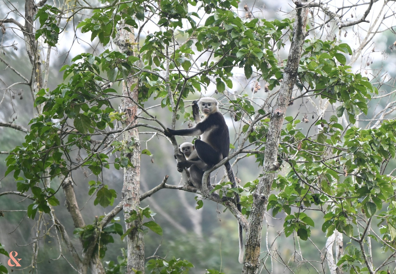 Bức ảnh ghi nhận hai cá thể mẹ con Voọc mũi hếch tại rừng Khau Ca trong đợt khảo sát tháng 12/2025.